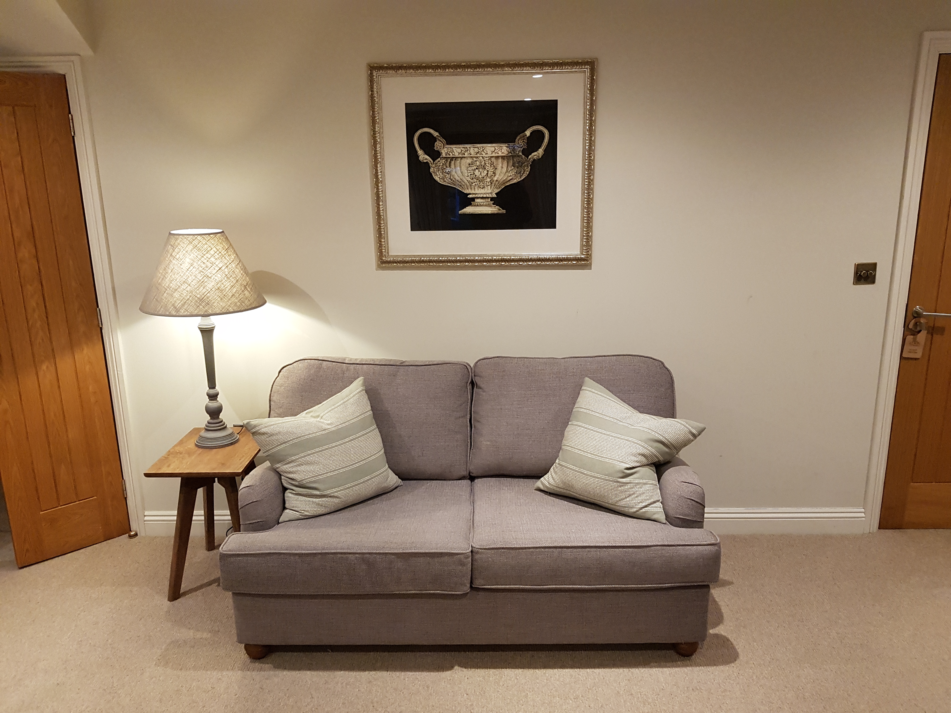 My room was finished in a relaxing and pleasant palette of French Grey and Old White complementing the floral wallpapers in grey and pale blue. The room was comfortably furnished with a large king size beds and velvet headboard. The bed was covered with a feather down filled duvets, soft pillows and woollen throws.