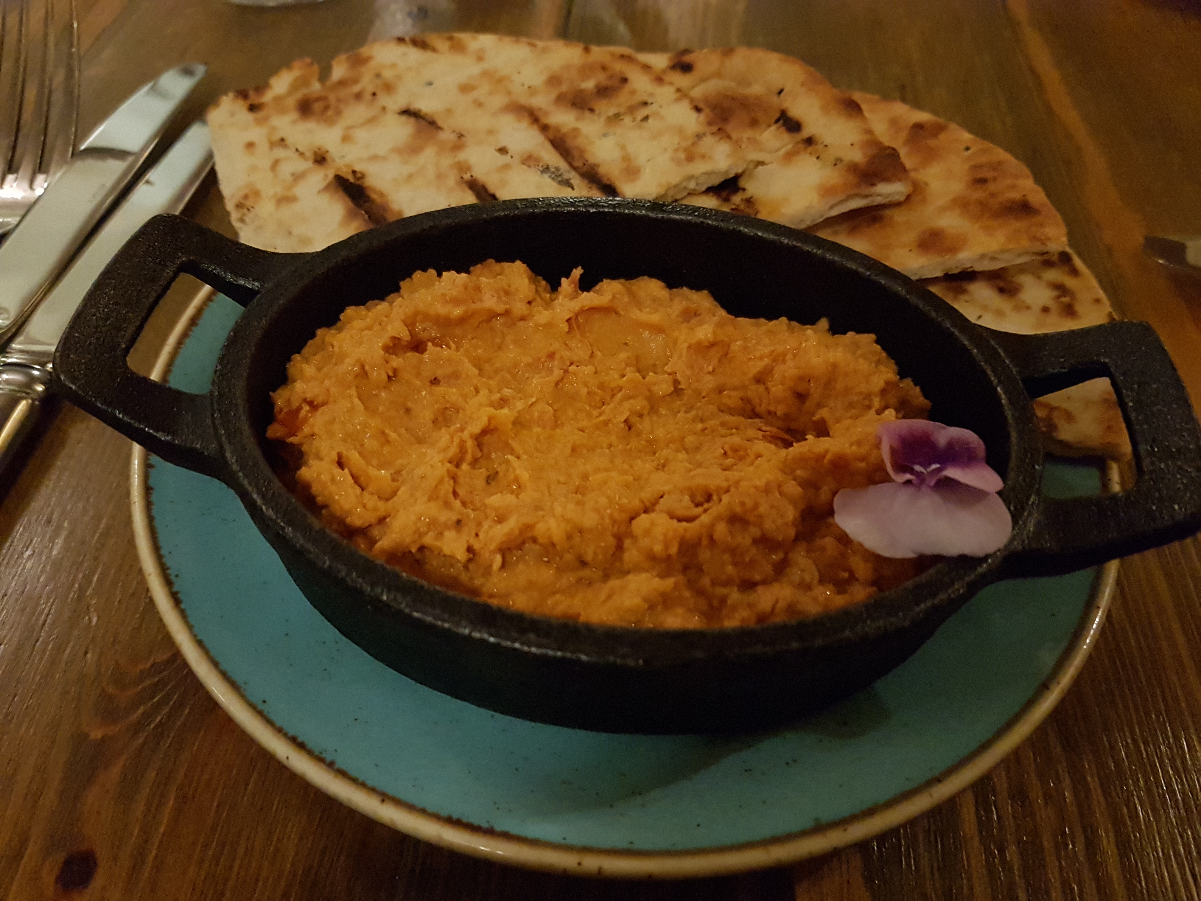 Instead of a starter my wife chose from the selection of three Morsels, which are described as `perfect to nibble while you decide` from the main menu! The Morsel was much more of a full starter than a morsel! She chose the Potted Sun – Blushed Tomato & Oregano Houmous with Lebanese Flatbread.