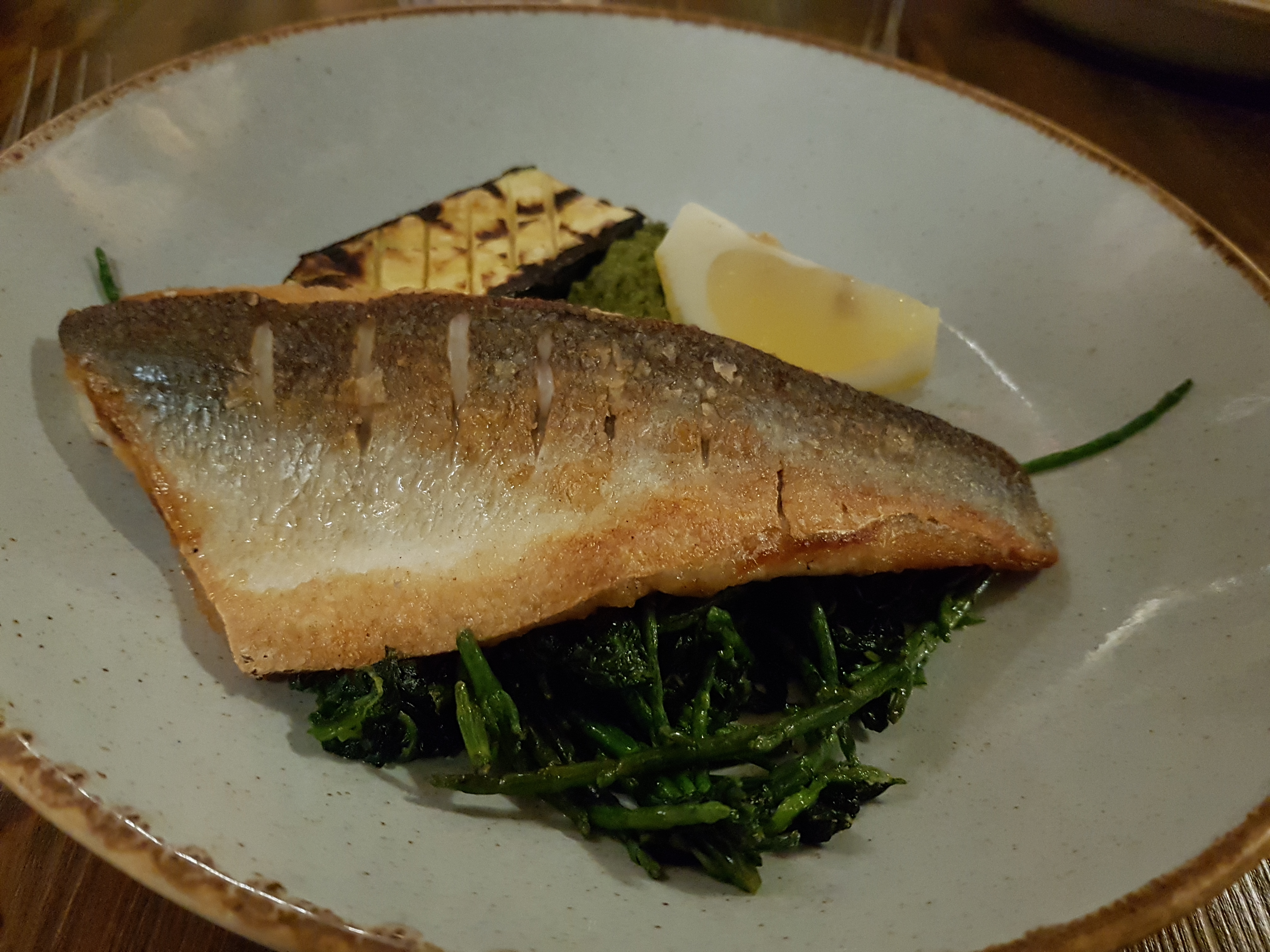 My wife chose the Pan – Roasted Sea Bass Fillet accompanied by Grilled courgette, Samphire, sautéed spinach and Salsa Verde. She said the fish was very tasty and perfectly cooked. She loved mixed samphire and spinach and described the salsa Verde as like a home-made pesto sauce! A delightful, tasty meal.