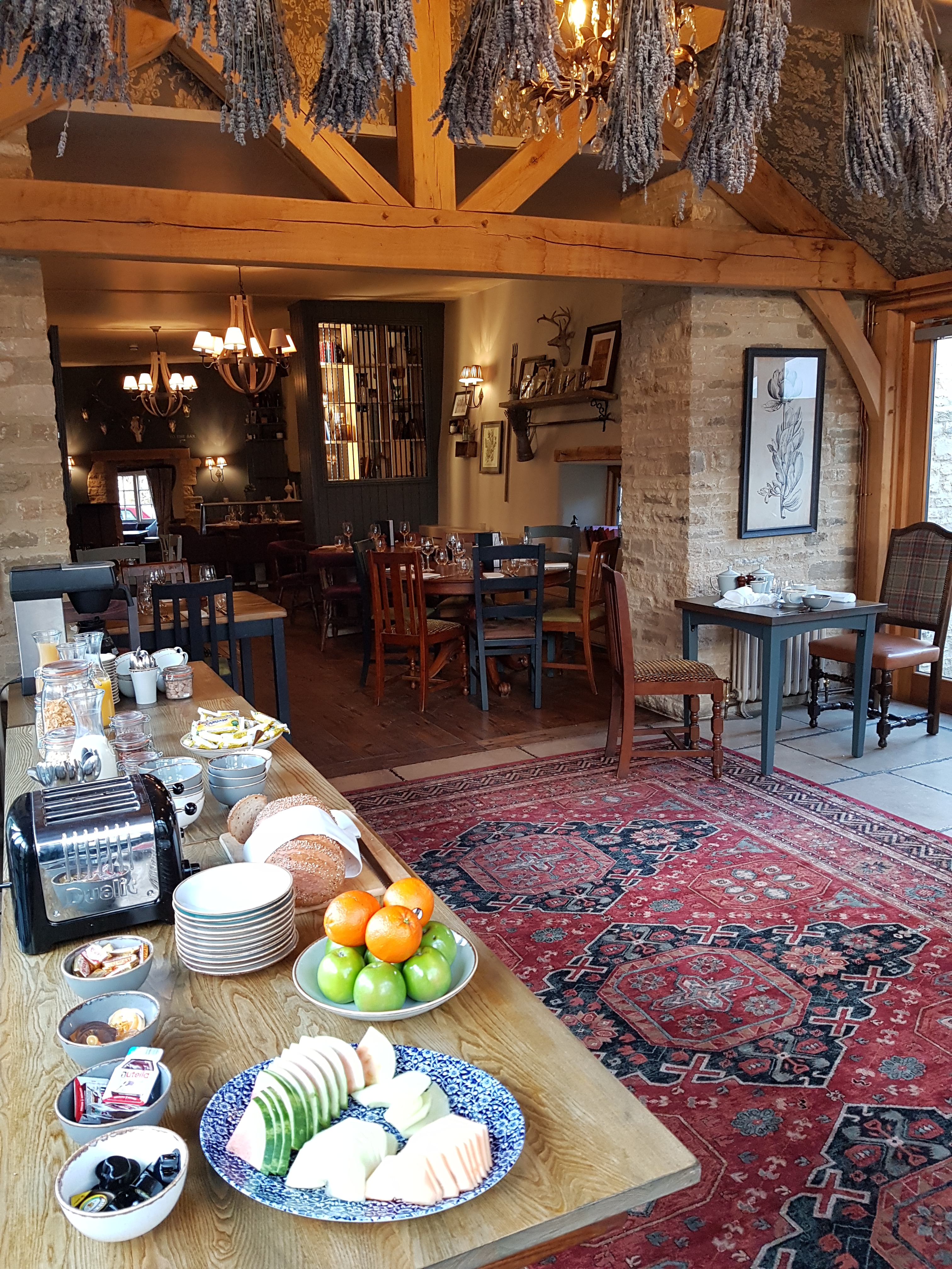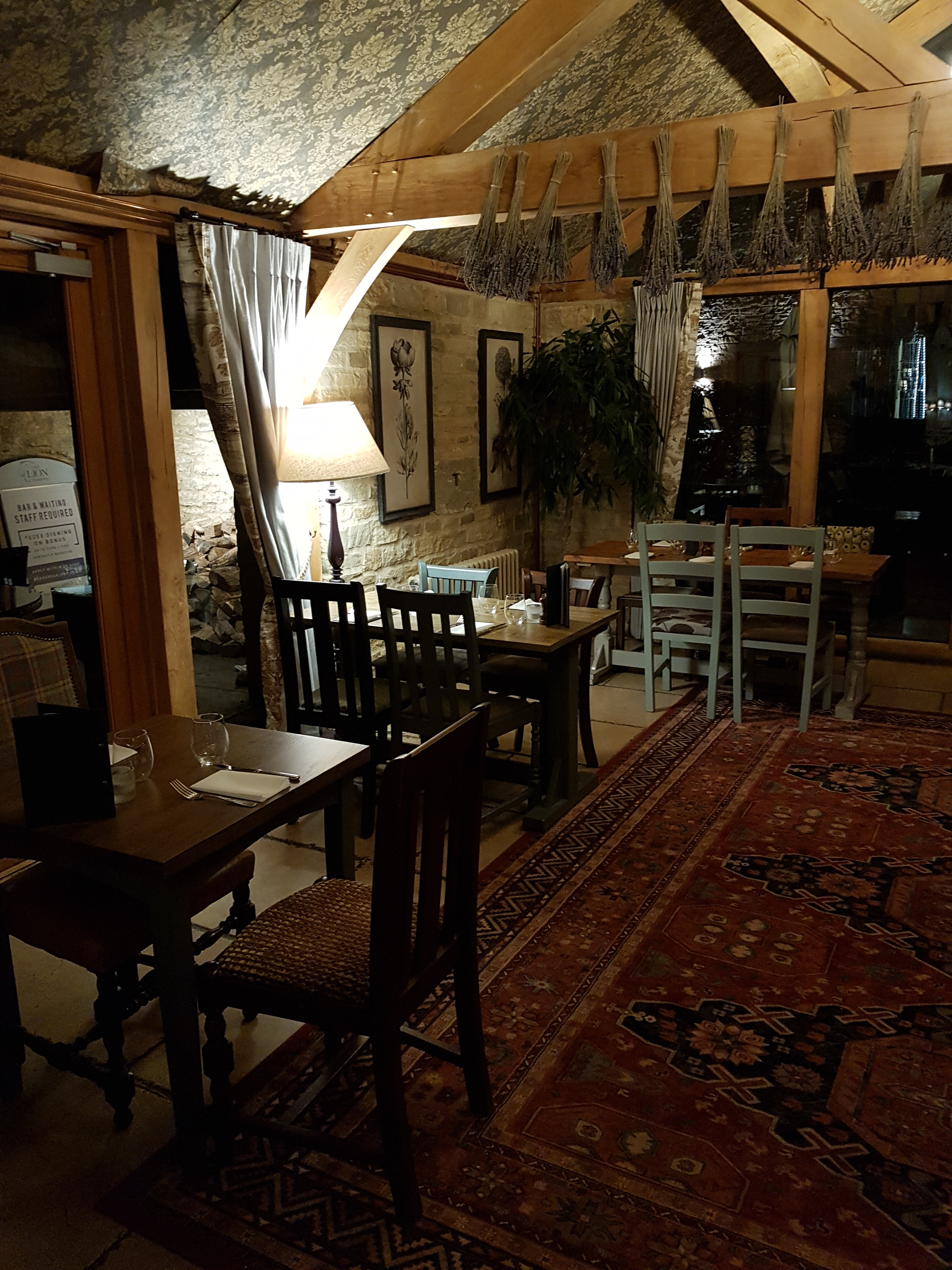 Garlands of Hops and Lavender adorned the thick low beams of the bar in fierce competition with some unusual pieces of objet d’art on various shelves and walls, vying for our attention..  The cosy bar is the perfect place for a pre-dinner drink or morning coffee, afternoon tea or after meal coffee.