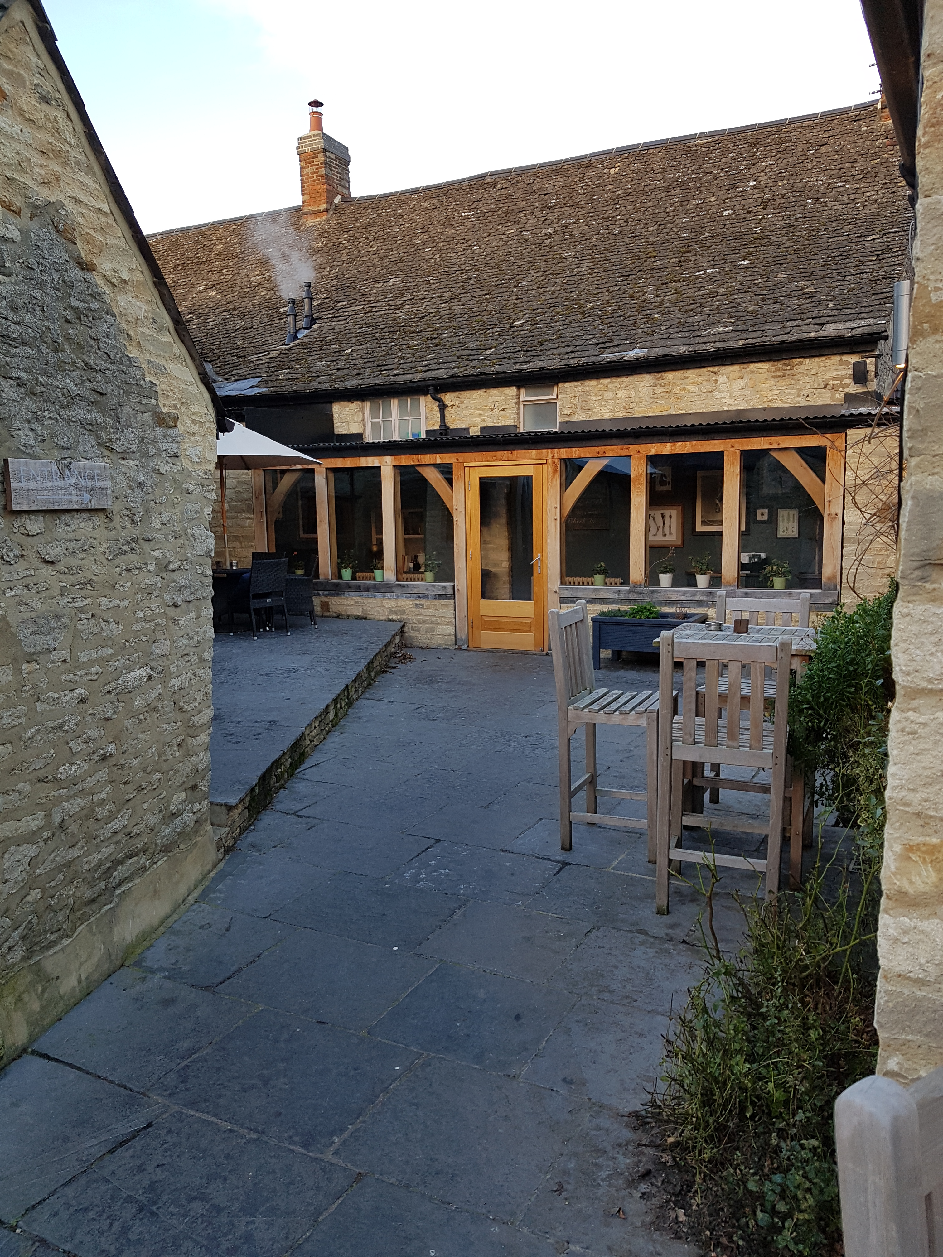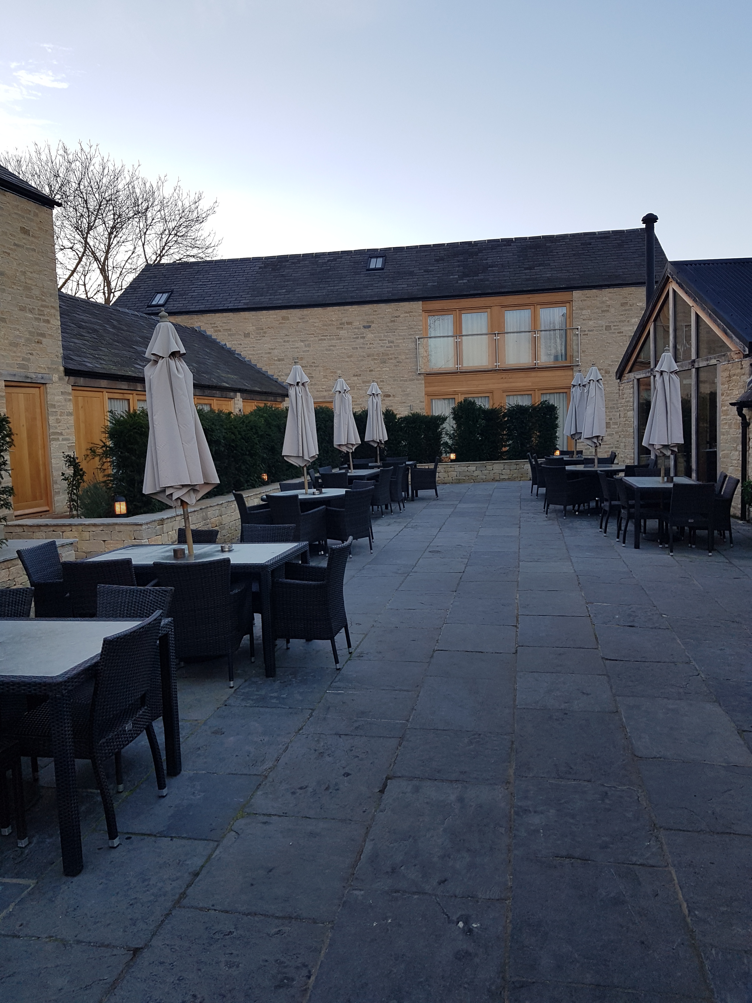 After relaxing in our room we walked across the walled courtyard into the main pub for our evening meal in the restaurant. The light and airy, green oak Barn-style conservatory dining room was where we ate in the evening and for breakfast. The area has rough-hewn Cotswold stone walls and green oak frames supporting a sky – high, vaulted ceiling and dried lavender strung along the central beam. There is also direct access to the rear terrace patio. A very pleasant place in which to dine.