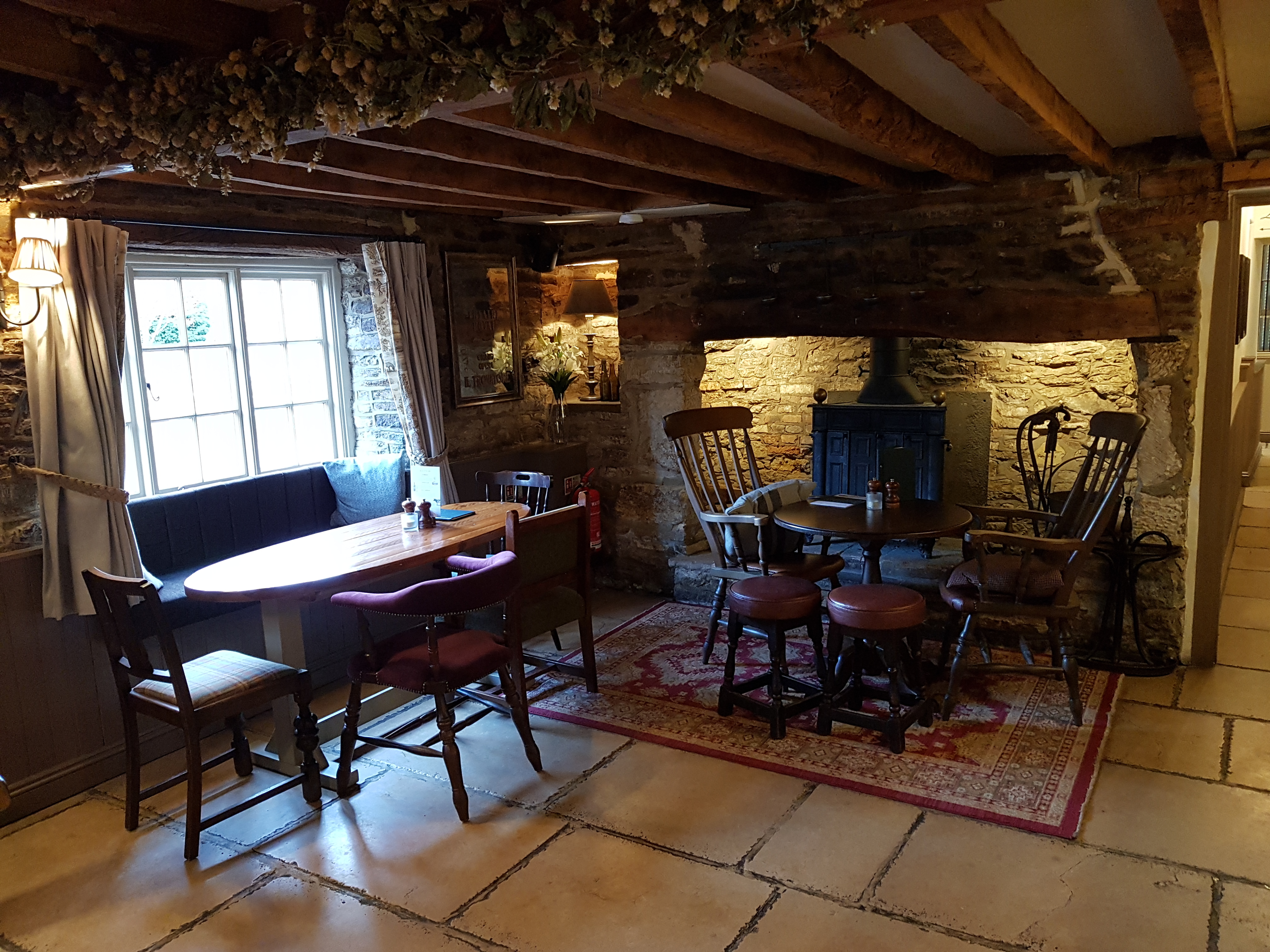 Many of the pubs original features have been retained, alongside the comfortable armchairs and upholstered window seats. Simple farmhouse-style tables and chairs contrast well with the original flagstone flooring, vintage rugs and three, traditional working fireplaces and a wood-burning stove to keep customers warm during the colder months.