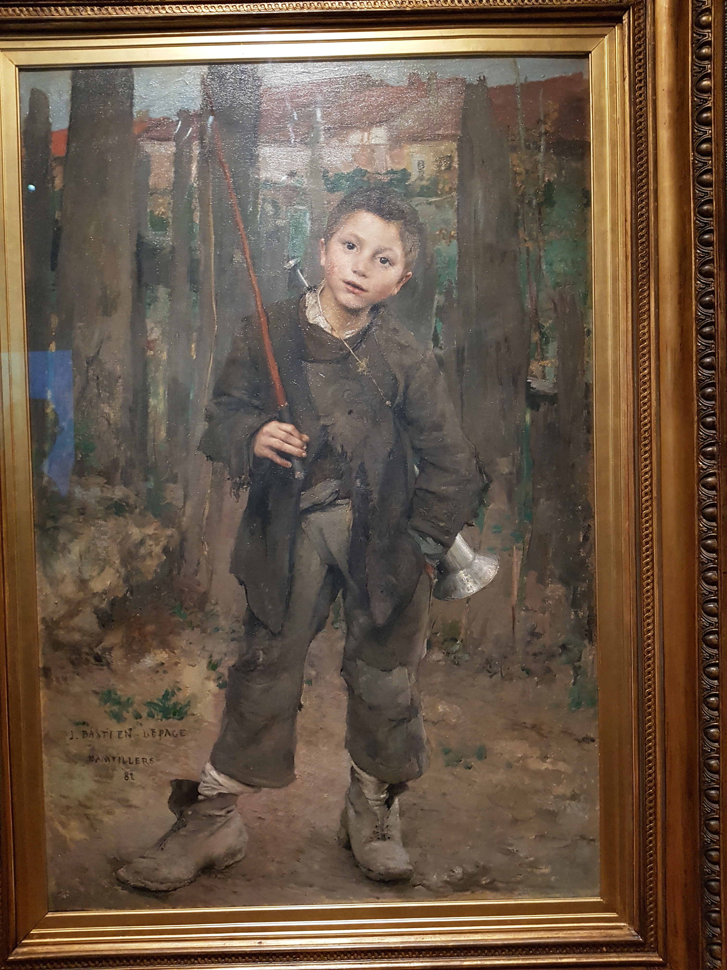 Another group of paintings presented children as strawberry sellers or beggar boys. This type of painting was known as ` fancy` pictures. Rather than put poor working country folk anonymously lost in a rural landscape, Jules – Bastien -Lepage draws attention to their dress and individual nature. In “Nothing Doing” he paints the boy in ragged clothes with oversized boots gazing freely back out at the viewer.