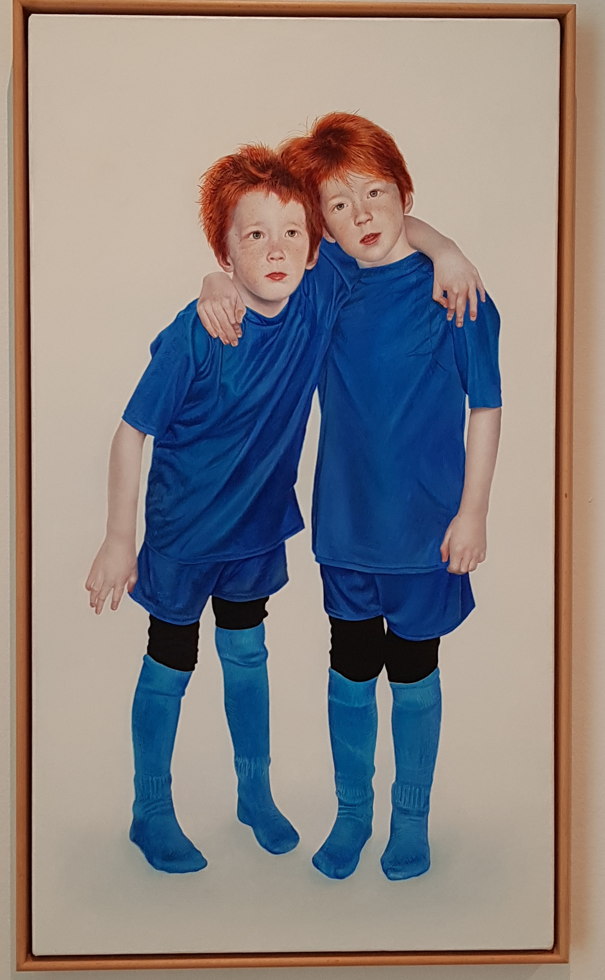 Mark Fairnington’s approach turns a scientific eye to the depiction of his identical twin sons with hyper-realistic precision, photographic like. Here he records the boys differences but also highlights their similarities. Mark developed this fine detailed technique while painting specimens of insects. He would use multiple photographs to generate images with detailed and complex surfaces.