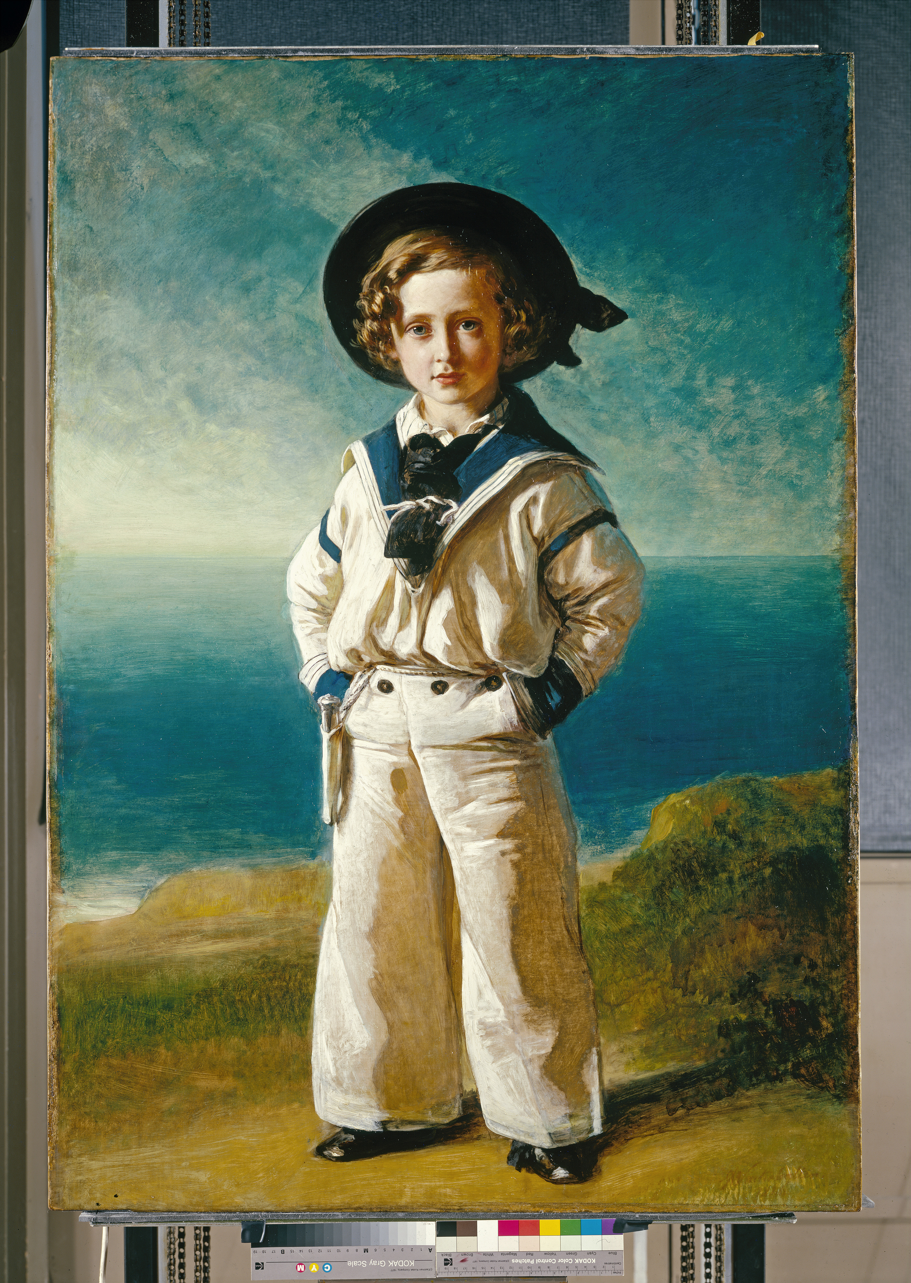 The formal dynastic royal paintings gave way to the romanticism of Victorian art demonstrated by the portrait of the young Prince of Wales made in 1846. Bertie, as he was known to his family was heir to the throne and is pictured as a carefree four year old with curly hair and a sailor suit beside a blue sea.