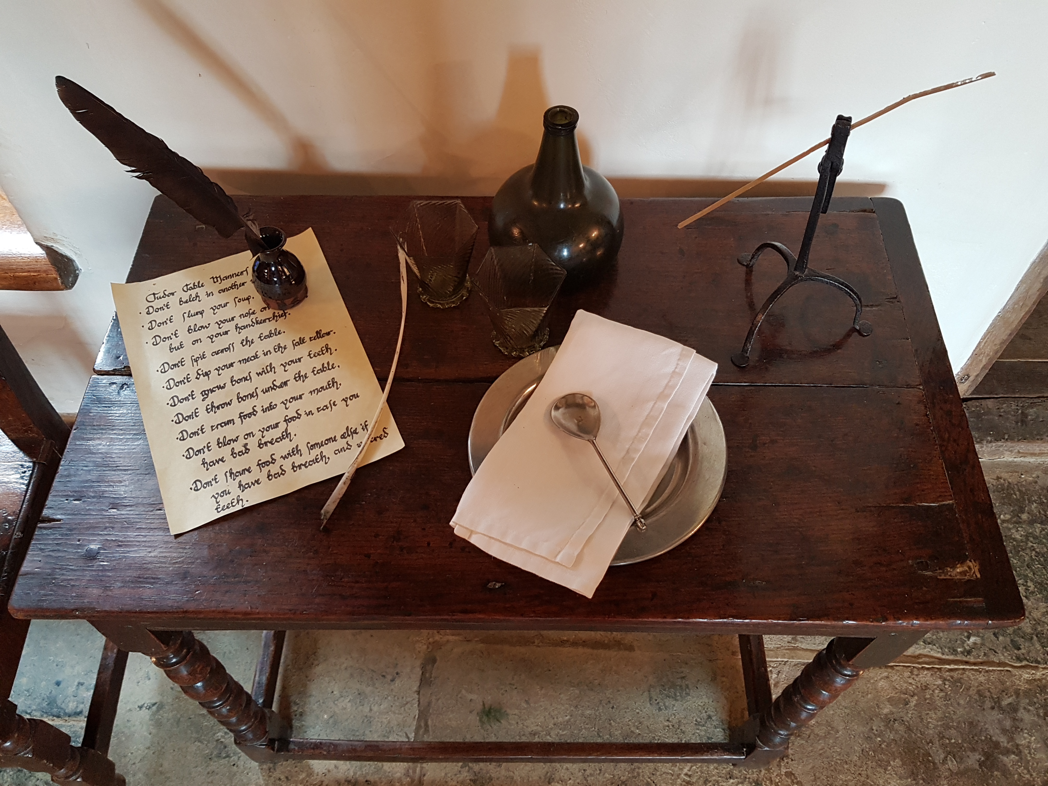 In 1700 the North Wing was built which is at right angles to the Tudor section and contains the Oak Parlour and Great Kitchen on the ground level. The kitchen was full of interesting items. The large Inglenook fireplace contained 3 ovens; one was brick lined for bread, one under the main fire for heating plates or food, and a charcoal brazier for heating irons. There was also a spit, which was turned by a series of wheels and chains. There were lots of pots and pans, utensils and menus showing some of the food of the time including Swan Pie!