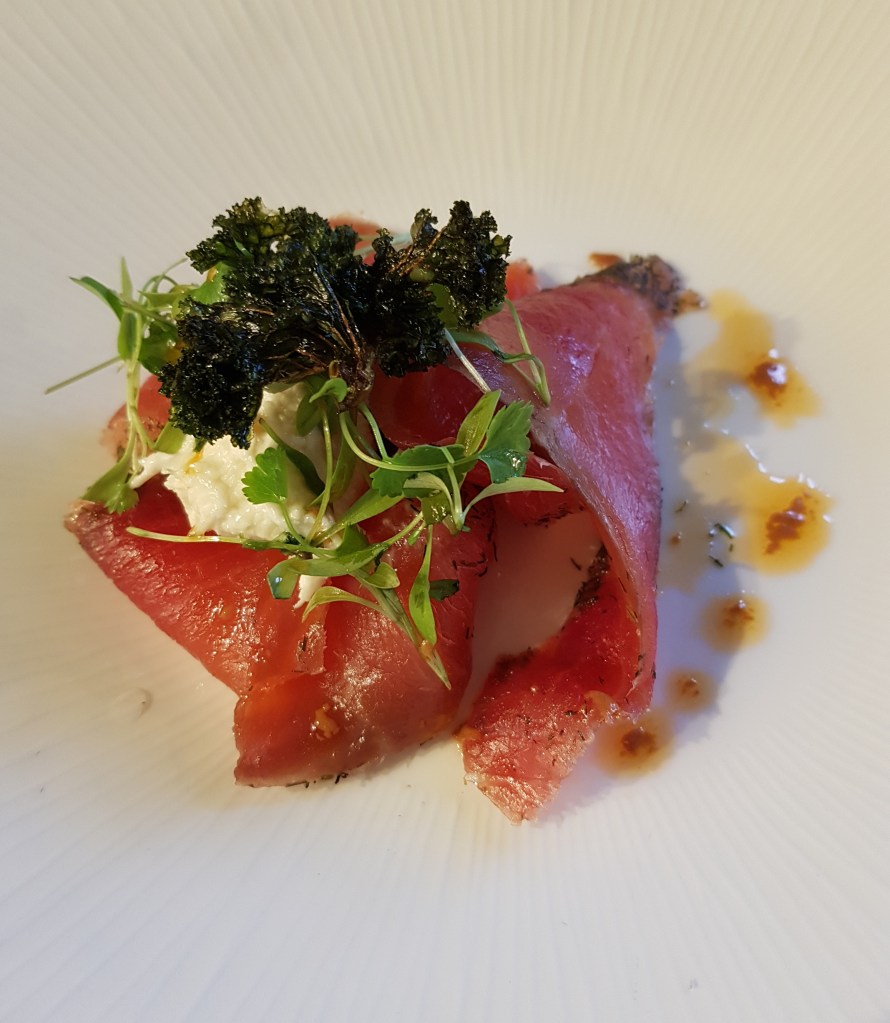 A delicious Scandinavian inspired recipe. The beetroot cured salmon gravadlax, or gravlax, is usually infused with sea salt, raw beetroot, lemon, orange and fresh dill. The generous serving of firm salmon had a very strong and vigorous flavour. The meal was served with Celeriac Mayonnaise topped with a few sprigs of Parsley. Simply delightful!