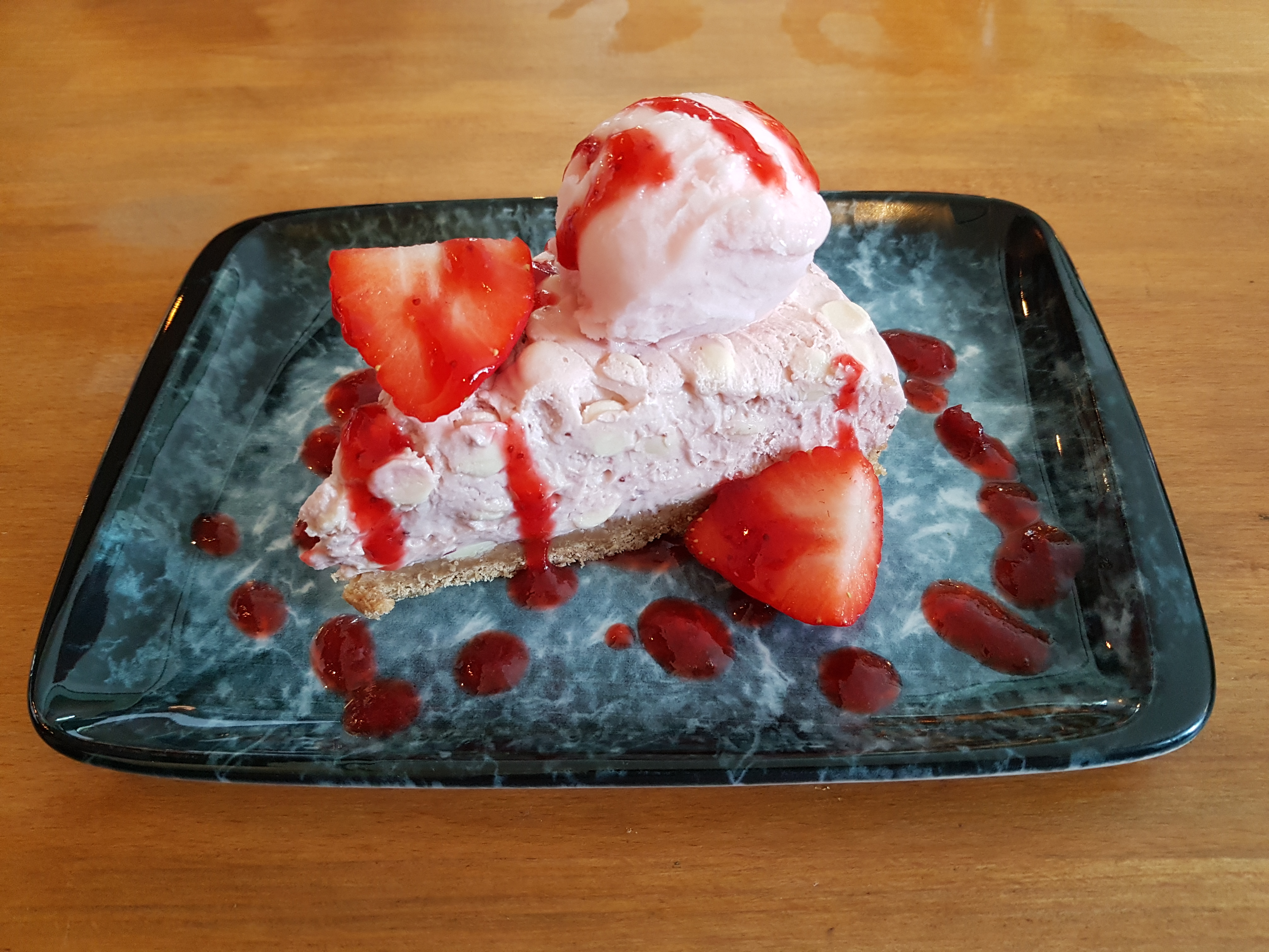- White Chocolate Strawberry & Pistachio Cheesecake Peach, Orange & Vodka Ice Cream. The cheesecake was impressive! Crunchy pieces of chocolate & pistachio. A delicious biscuit base. Loved it so much.