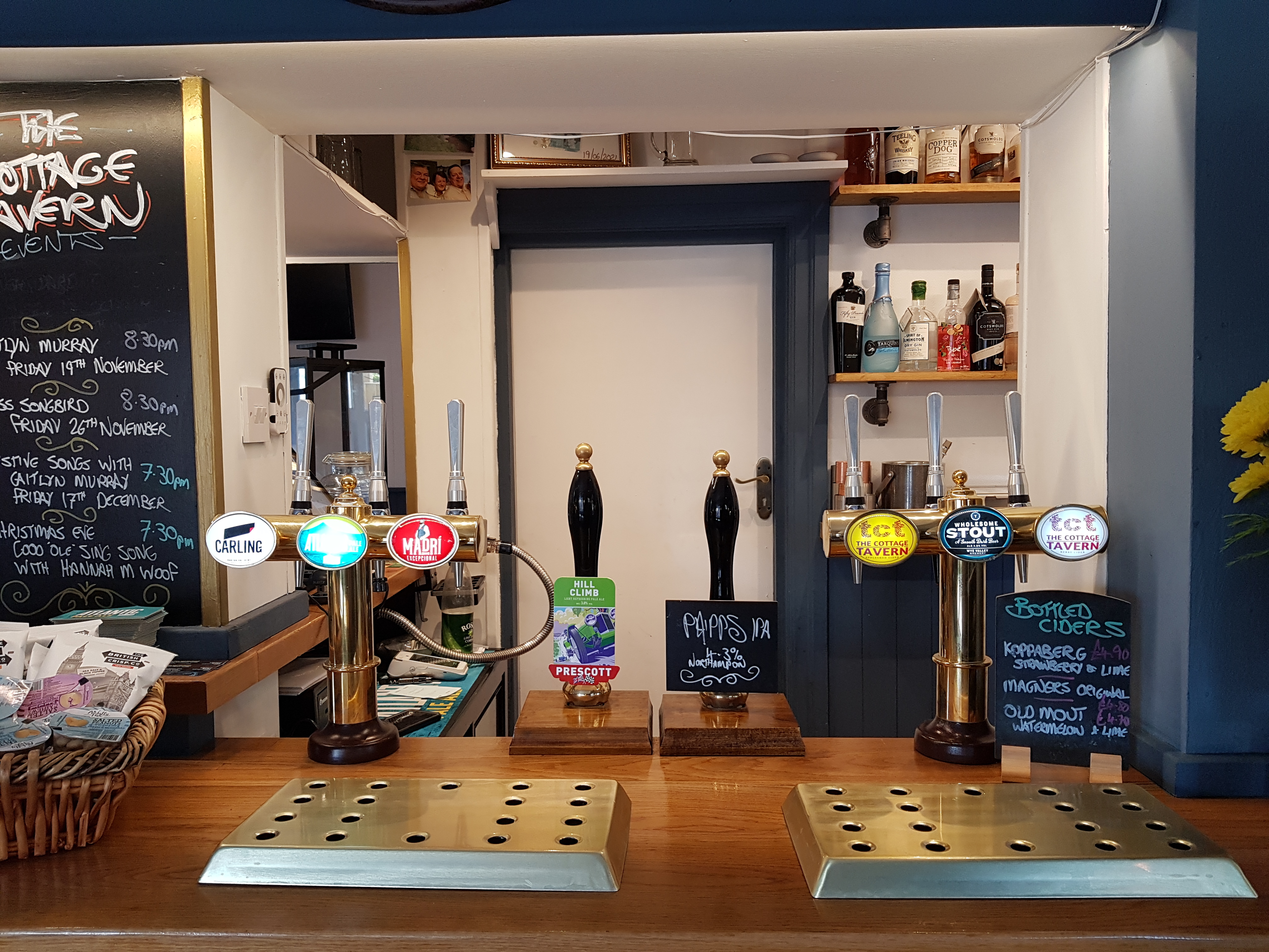 The Cottage Tavern is a small compact village pub. When my wife & I entered the Tavern, hosts Mark & Tim warmly welcomed us. The bar is centrally positioned splitting the pub comfortably into two sections, painted a modern pastel blue to the left complemented with a rich forest green to the right There is a fire place at each end of the pub.
