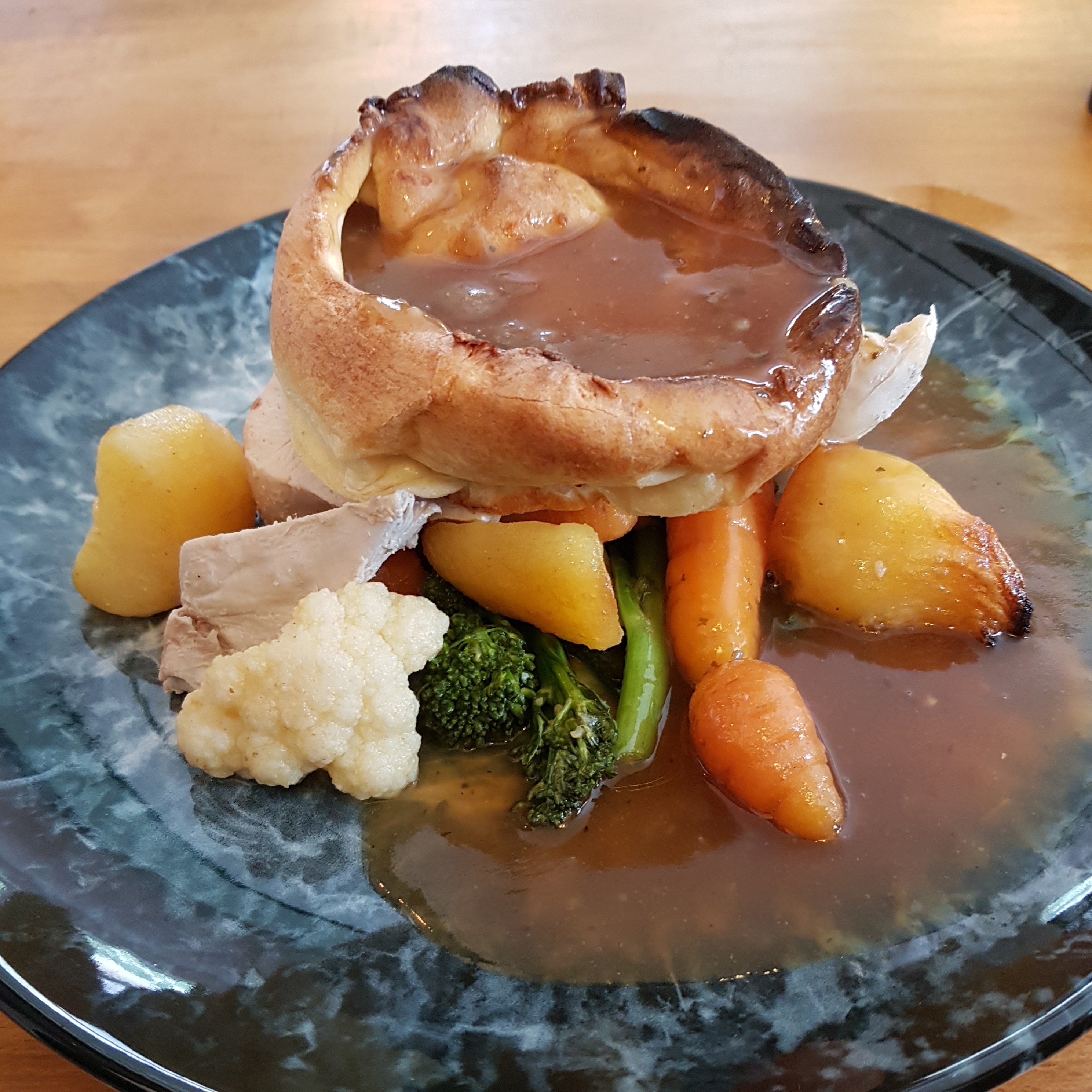 The vegetables of sprouted broccoli, cauliflower, baby carrots & roast potatoes were perfectly cooked and the perfect accompaniment to our Sunday roast. The Onion & Sage Gravy were very tasty. I must admit to trying some of my wife’s meal and can vouch that both dishes were beautifully cooked and presented to table.