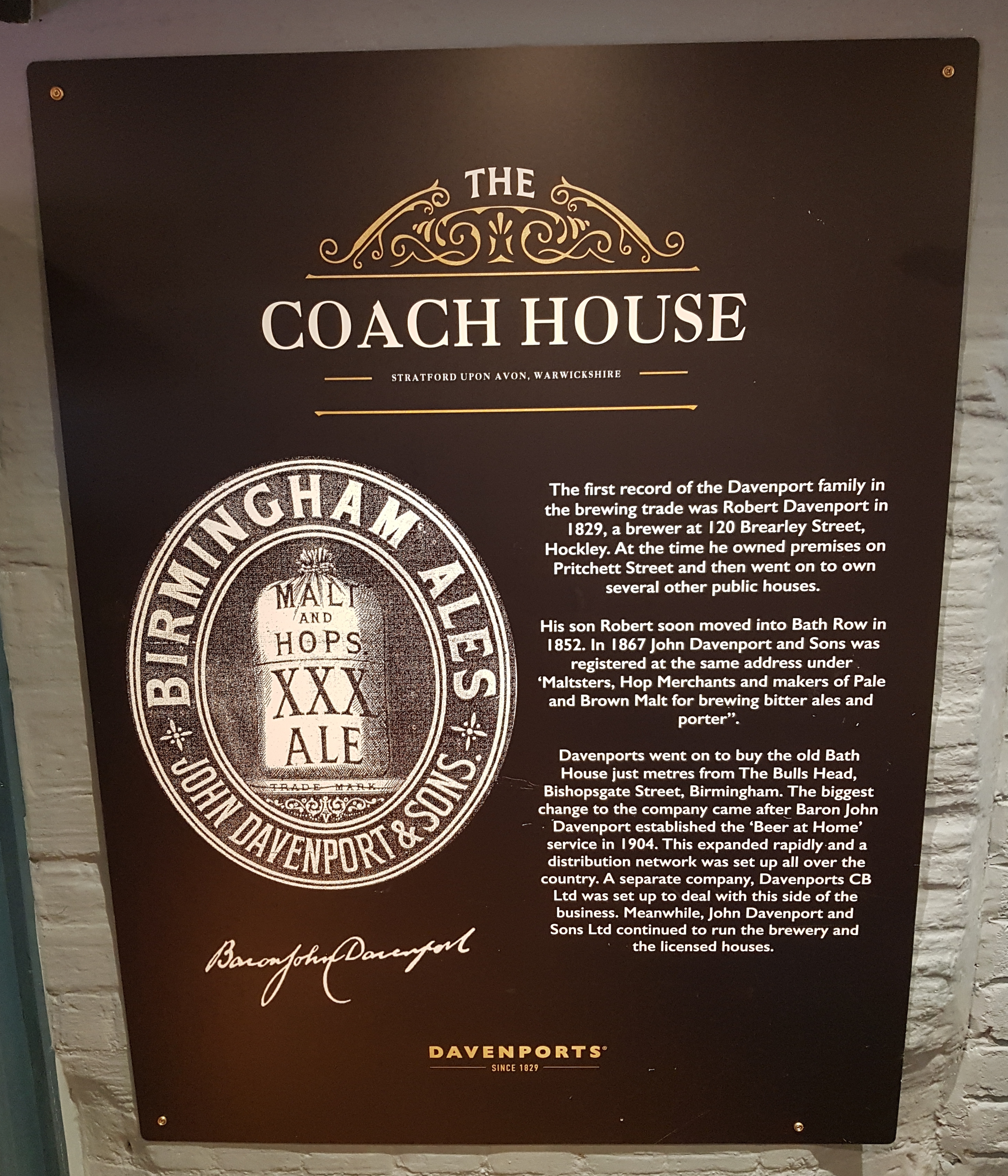 On entering the pub through a small porch, the first thing customers will notice is the long attractive central bar which partitions the two sides of the pub. There are several large boards with references to Davenports detailing the brewer’s history, familiar slogans, vintage photographs and a neat wallpaper design showing Davenports beer labels. There was a clean fresh look and space about this room. In a small open alcove in the middle of the room stood a bust of the Bard of Avon referencing the town’s most famous son.