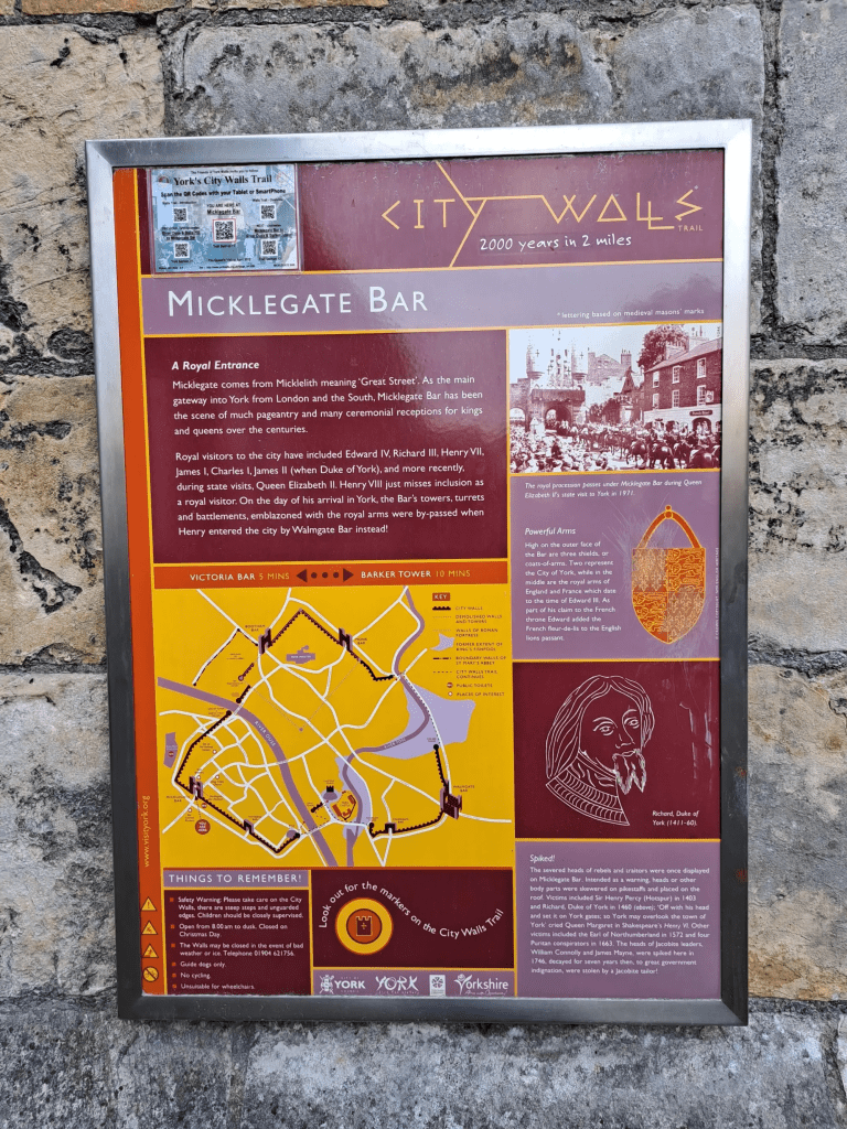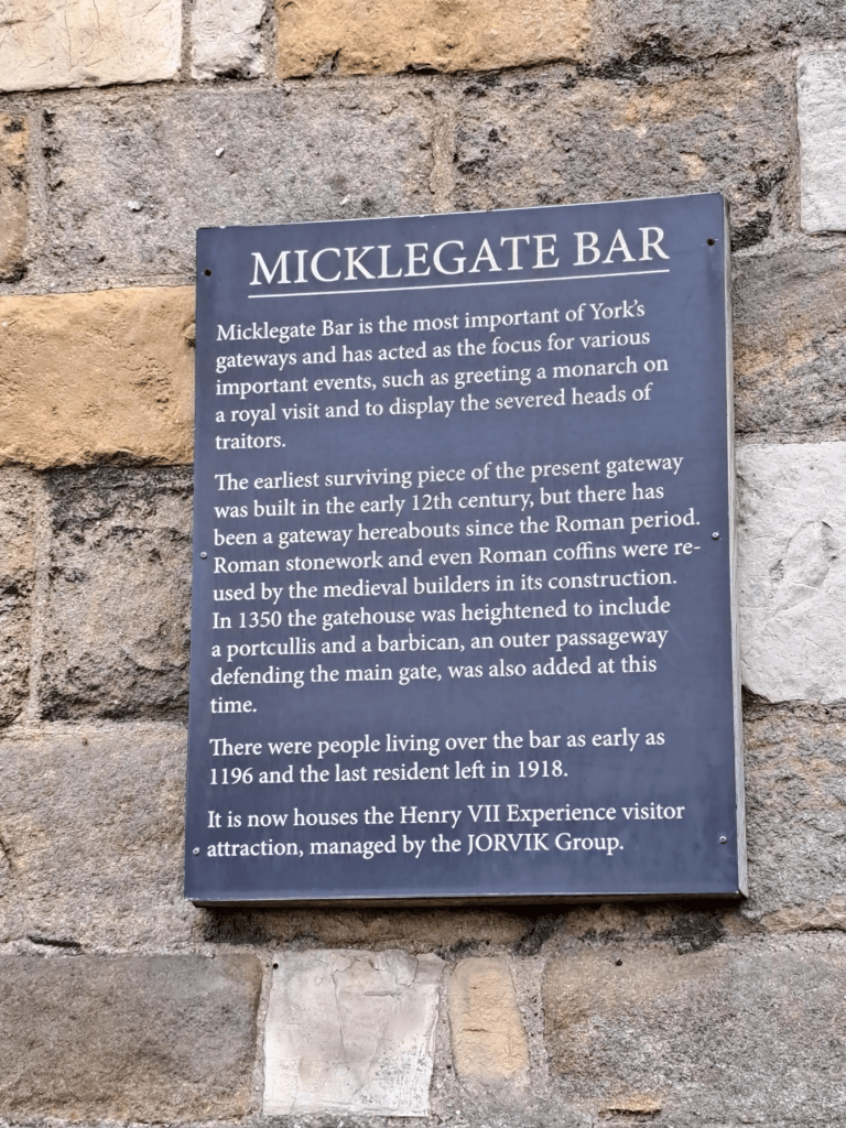 York has, since Roman times, been defended by walls of one form or another. Substantial portions of the walls remain, and York has more miles of intact wall than any other city in England. The walls are generally 13 feet (4m) high and 6 feet (1.8m) wide. Before going up onto the walls I was invited to the City Walls Experience, formerly known as the Henry VII Experience, located in the southern gatehouse at Mickelgate Bar which was about five minutes’ walk from my Hotel, The Principal. Historically the main entrance to the city for anyone arriving from the south, at least six reigning monarchs are known to have passed through this gate, so I was in very exclusive company! A restoration of the Bar was completed in late 2017 and the City Walls Experience opened this year in 2022!