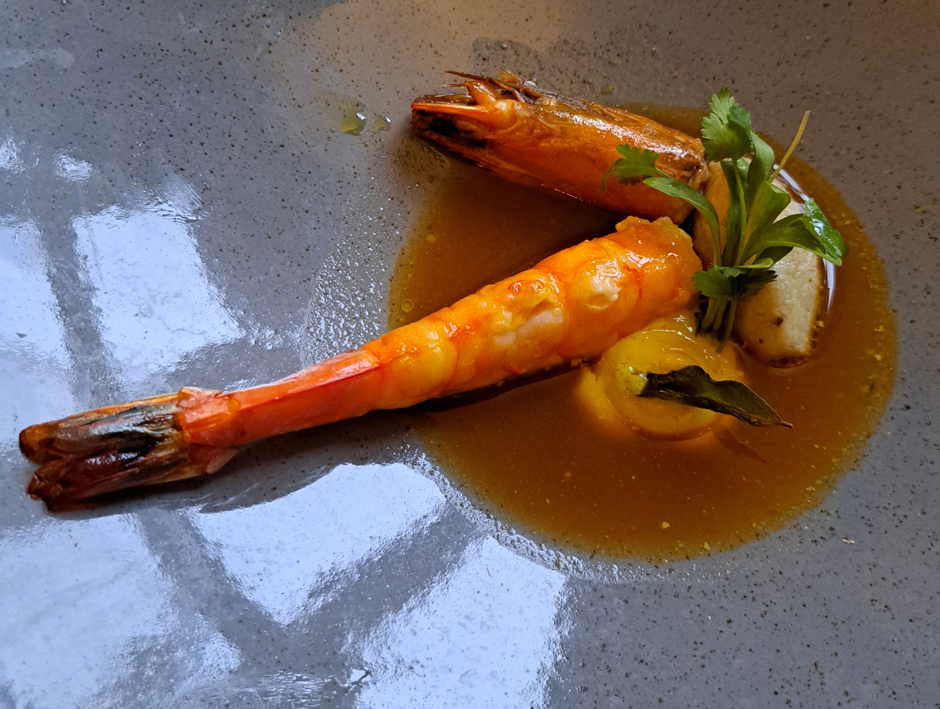 Rassam & Prawn – Grilled Tiger prawn, curry emulsion, coconut chutney, southern – Indian style spiced tomato broth