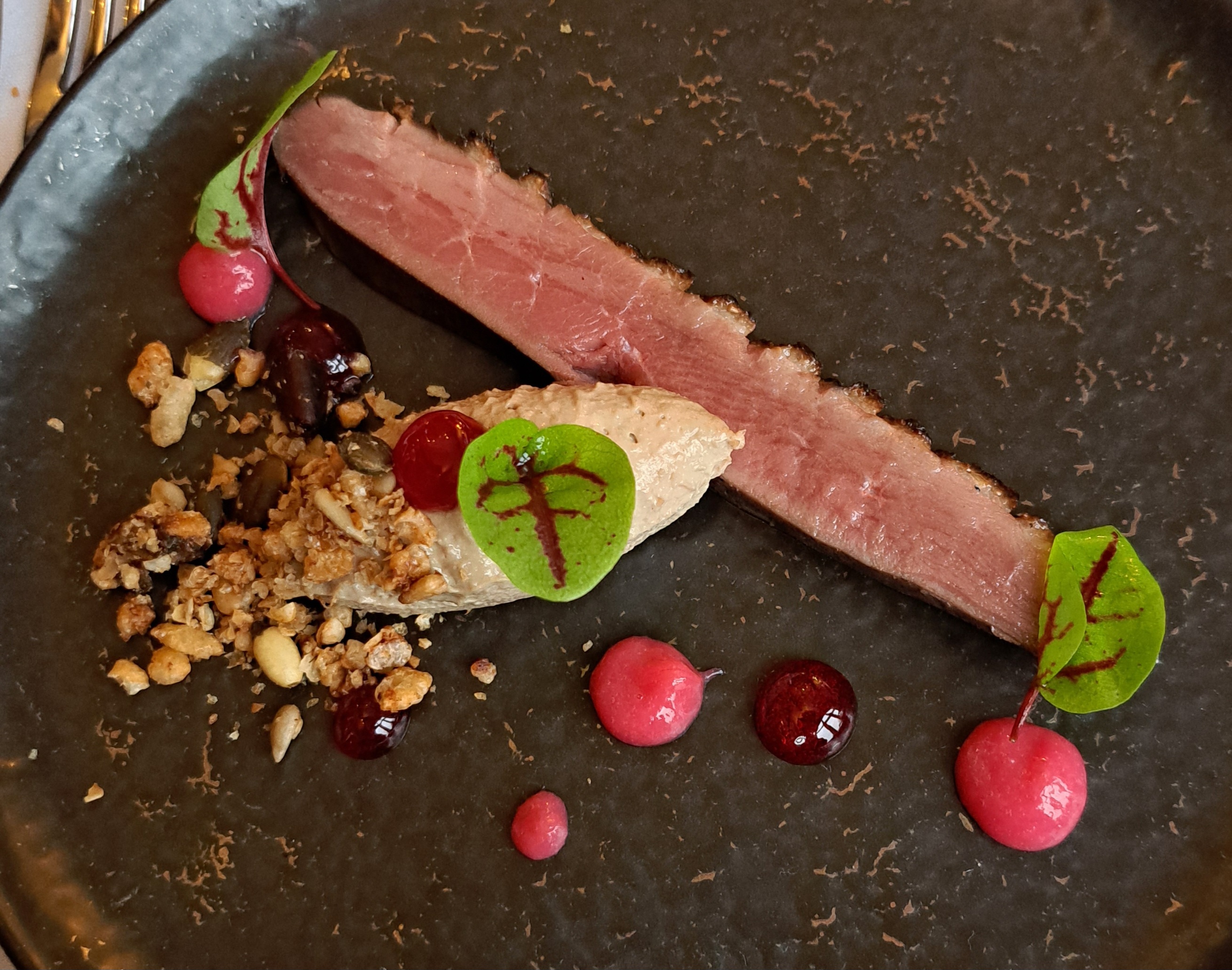 Smoked Duck & Rhubarb – Smoked Duck breast, duck liver parfait, textures of rhubarb & granola.
