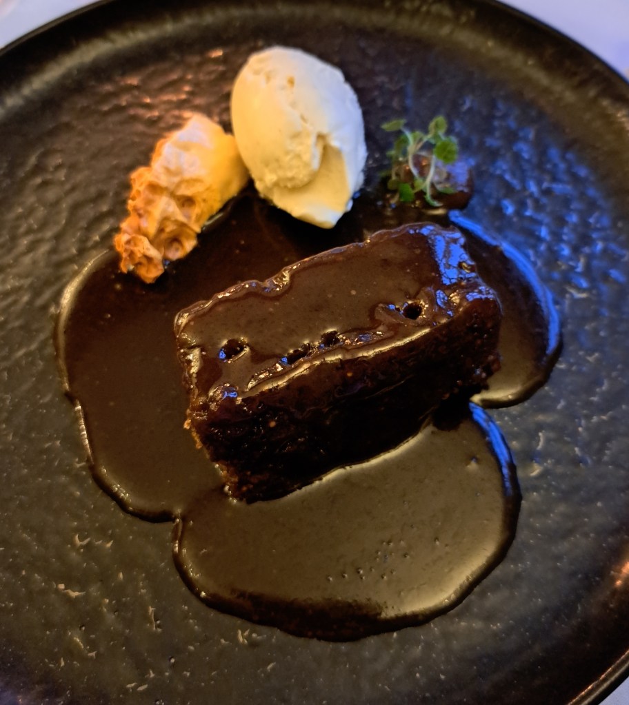 Date & Fig Pudding – Date & Fig pudding, toffee sauce, Tonka bean ice – cream, fig gel & honeycomb