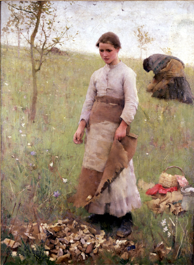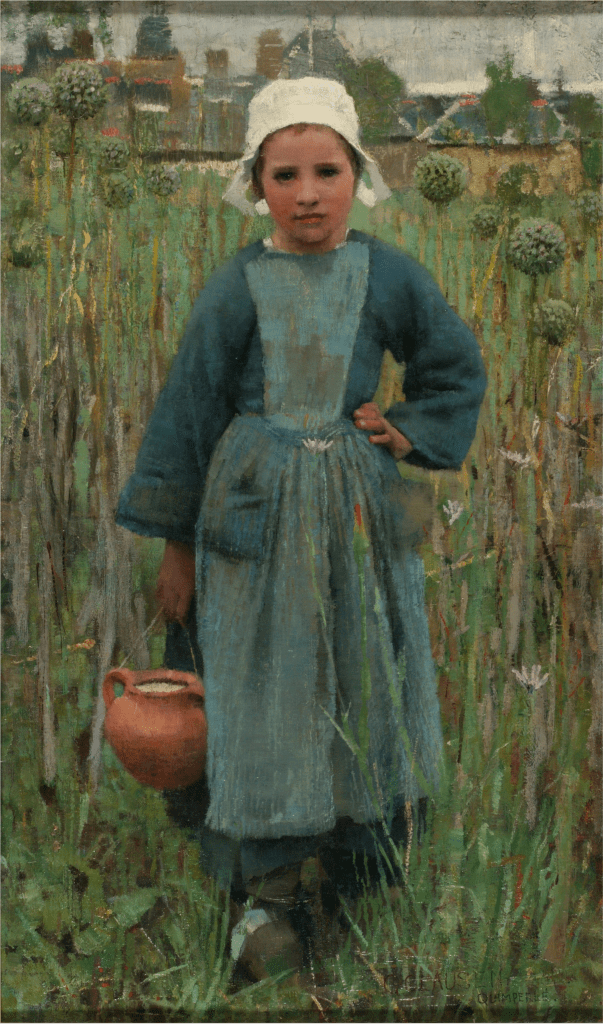 In 1882, George Clausen spent a brief period in the artists’ colony of Quimperlé in Brittany, where he painted Peasant Girl Carrying a Jar, Quimperlé (Victoria and Albert Museum), surrounded by globe-shaped onion flower heads. Integrated into the field surroundings by Clausen’s blunt-edged brushwork, the girl wears coarse clothing that indicates her life of poverty and hard work.