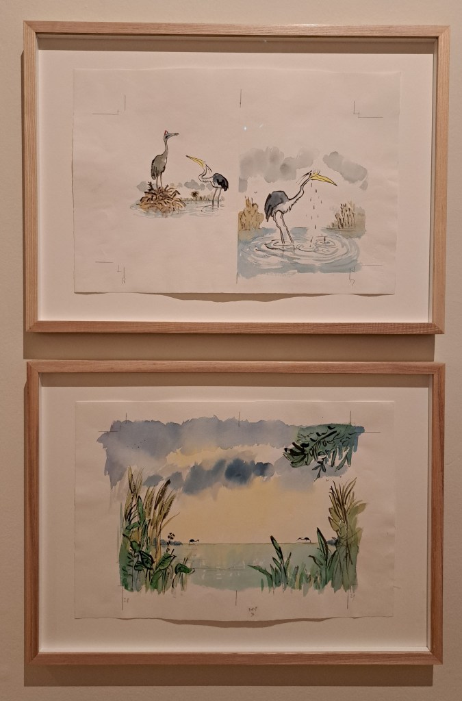 Drawings from Quentin’s own picture books, including his mischievous ‘Cockatoos’ and the eccentric Professor Dupont are displayed alongside illustrative work for fellow authors such as John Yeoman (‘The Heron and the Crane’ & ‘Up with Birds!’) and co-writer Emanuele Luzzati (Three Little Owls). The series of watercolour works for The Green Ship are simply wonderful, adding a new dimension to topiary!
