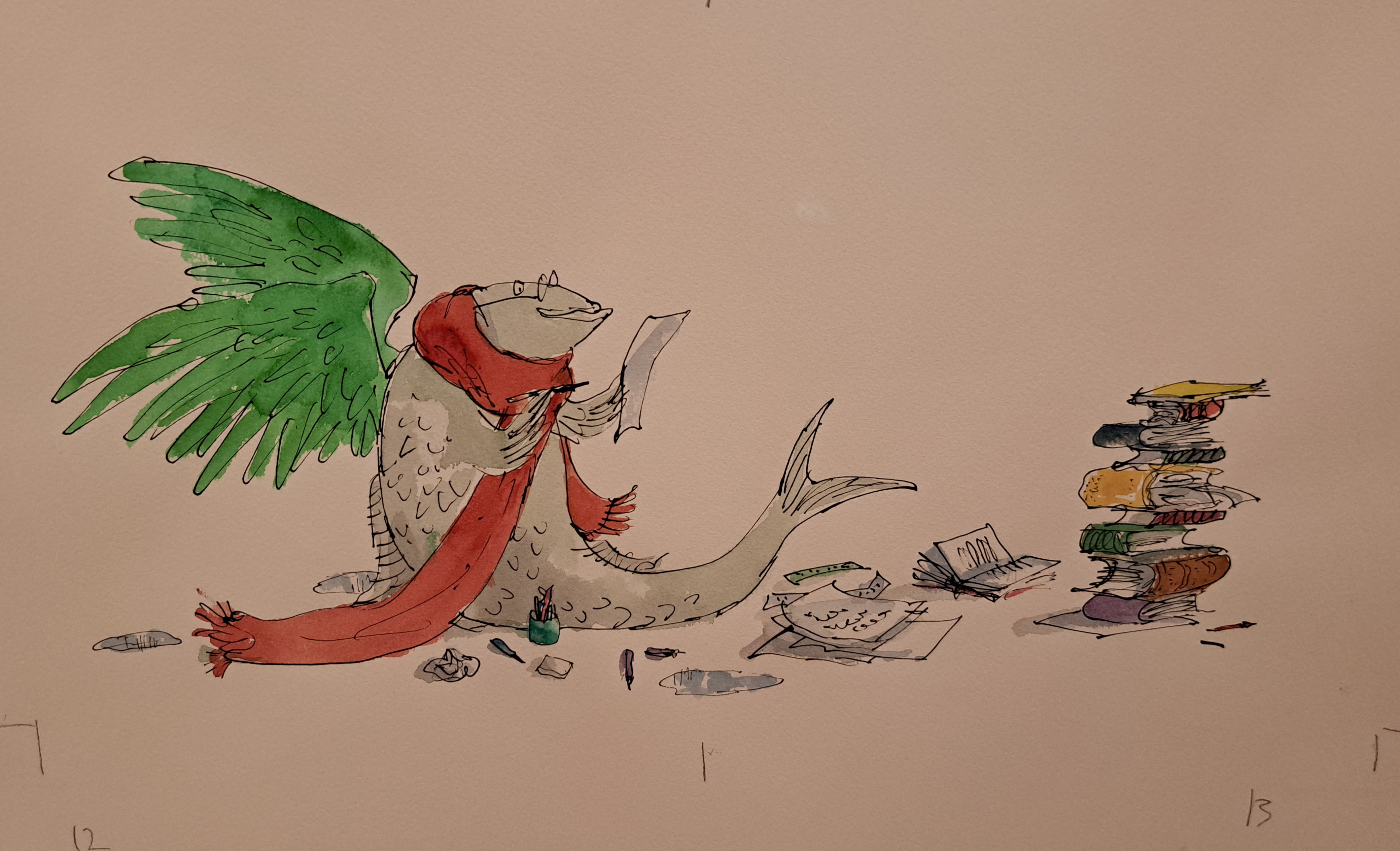 Visitors can enjoy a look at more birds, beasts and insects which have appeared in hospitals such as Kensington & Chelsea Mental Health Centre or other settings beyond the pages of books including a 3-metre tapestry of a griffin, based on one of Quentin’s original watercolours, and drawings of dragons from the series of works for the Dragon Centre at St George’s Hospital in Tooting.