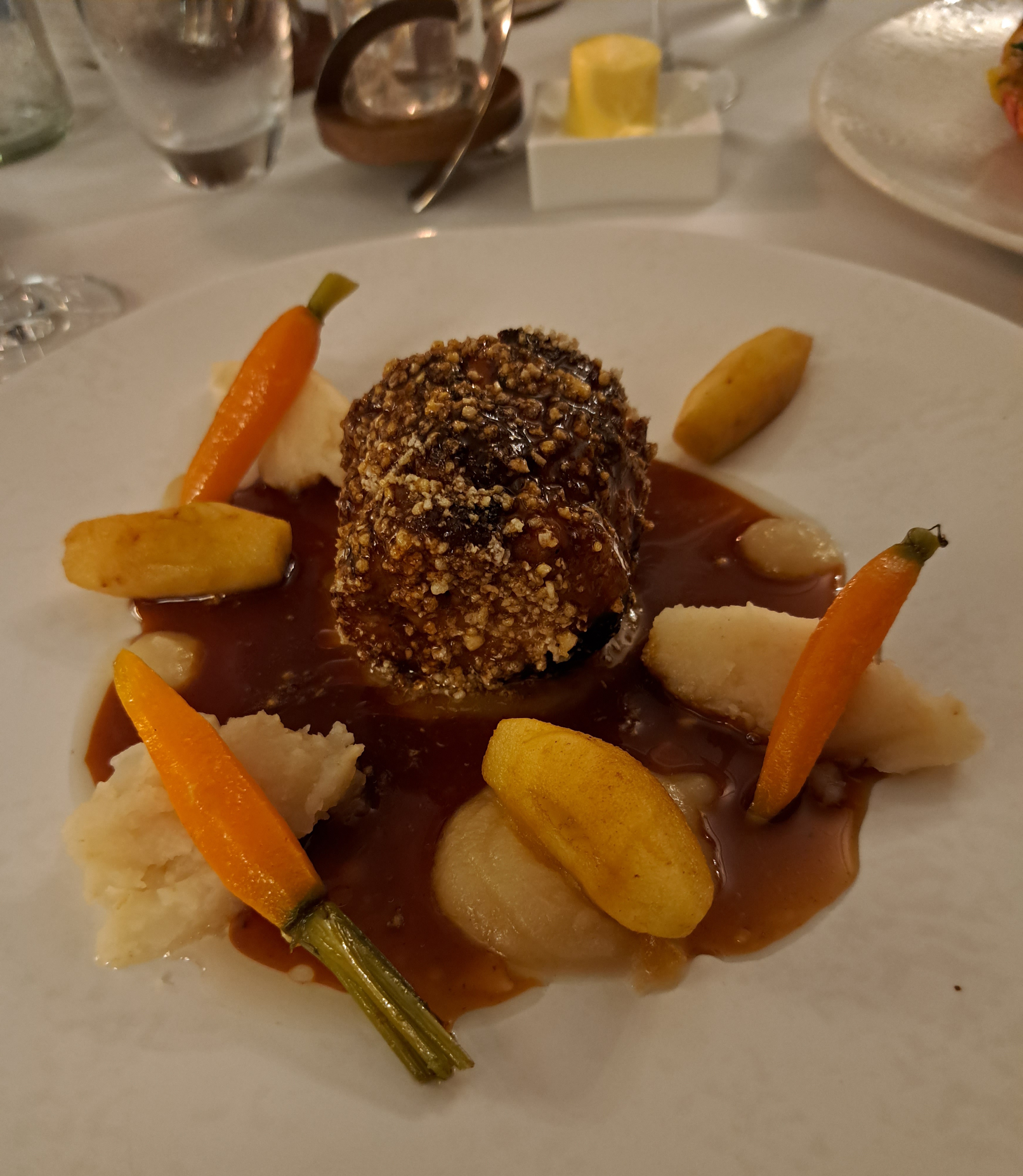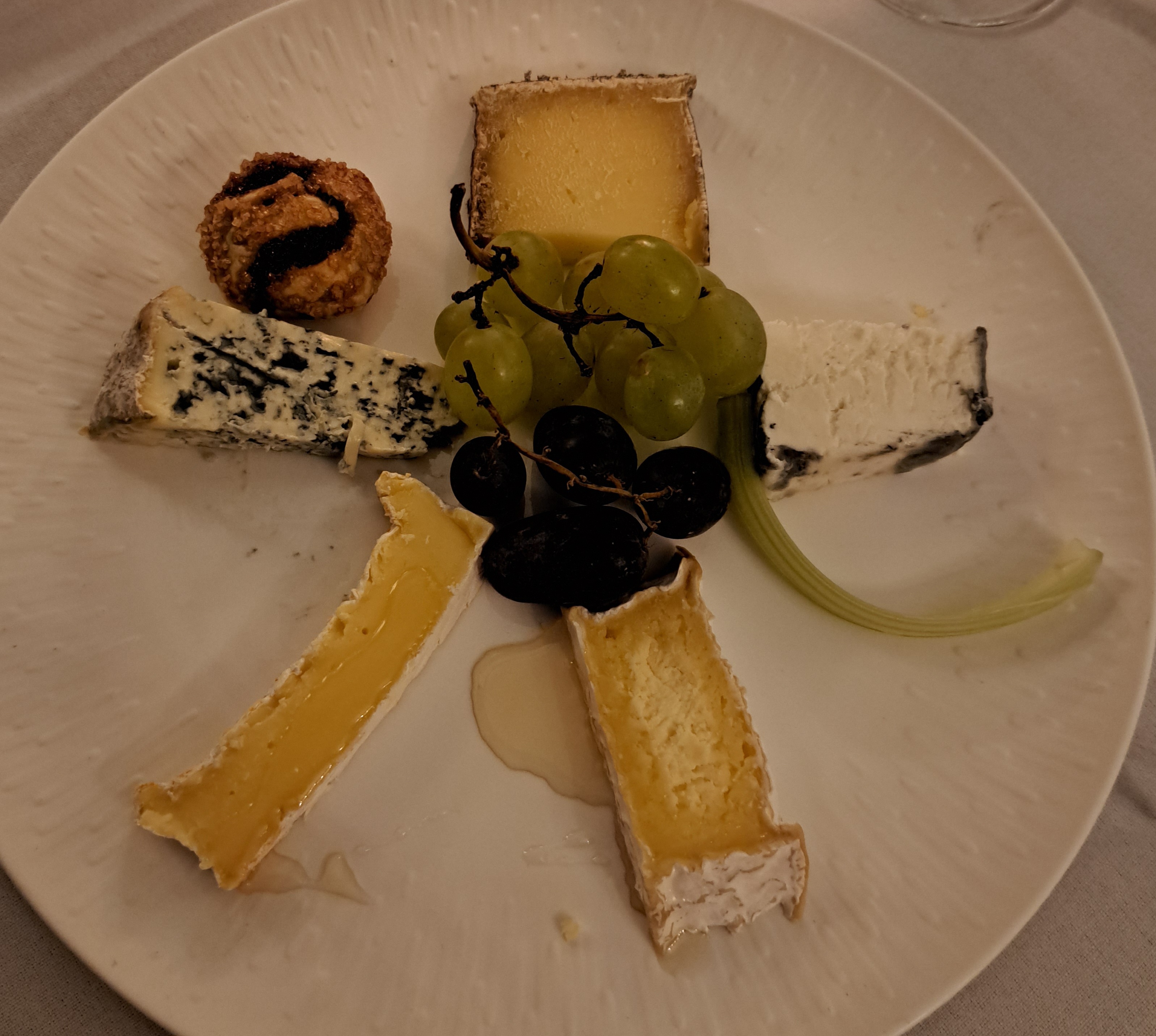 A selection of French & British cheeses & bread rolls paired with chutney, grapes, celery, Eccles cakes & truffle honey – Neufchâtel, Swiss Mountain Cheese, Goats cheese, Pont-l’Évêque & Bordeaux Bleu. The restaurant manager recommended the cheese board & pairings which my wife & I loved. I would usually be thinking about pairing wines with cheese but from now on will be considering my cheese pairings with small fruits & vegetables. My dinner parties will never be the same again!
