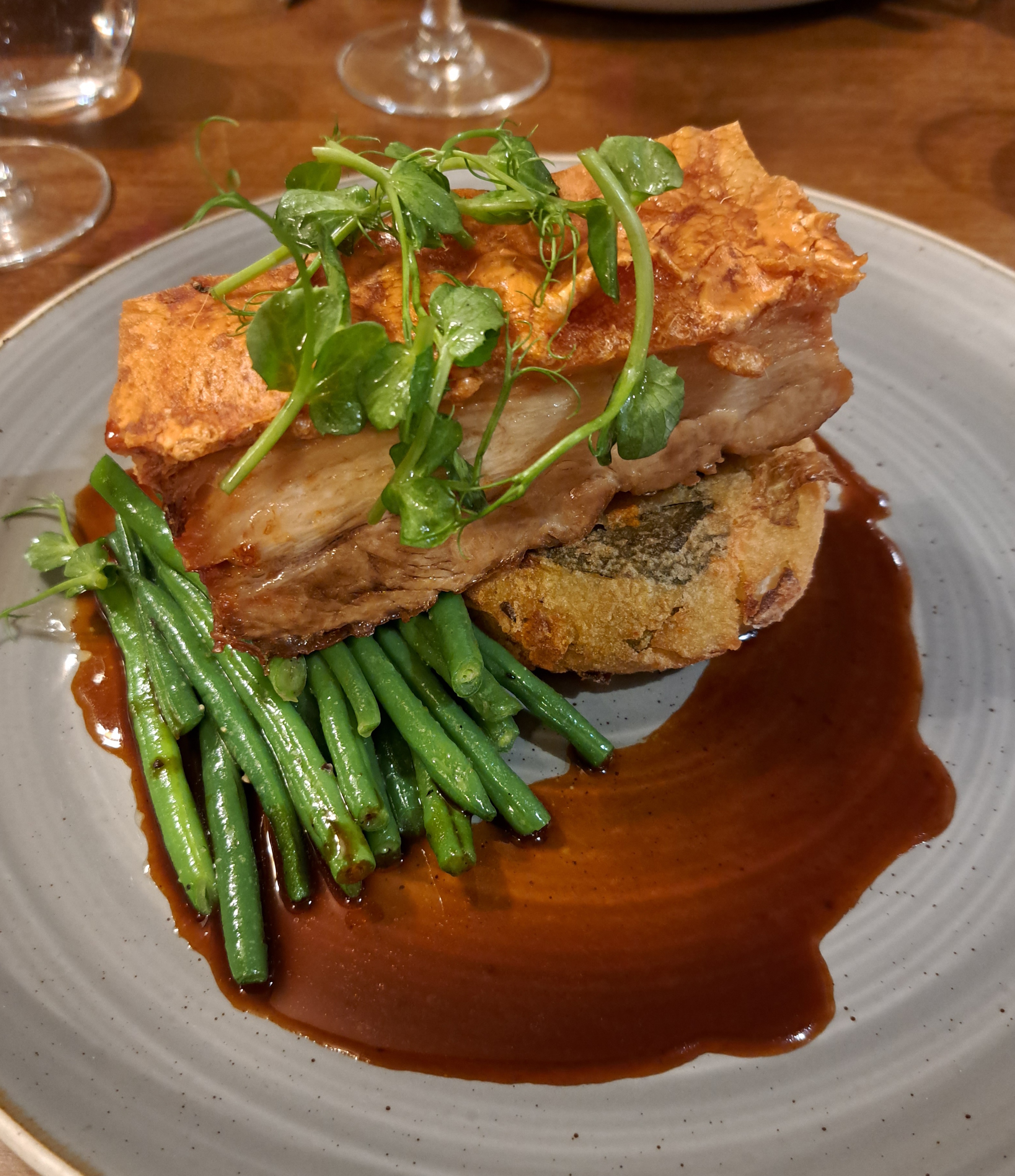 Pork Belly, Bubble ānā Squeak, Green Beans, Red Wine Jus Ā£20.95 (gf) Excellent, essential crackling topped a piece of simply delicious pork belly. Loved the Bubble ānā Squeak with small pieces of carrot, cabbage & peas. When cooked well you cannot beat pork belly and this was cooked well! Delicious.