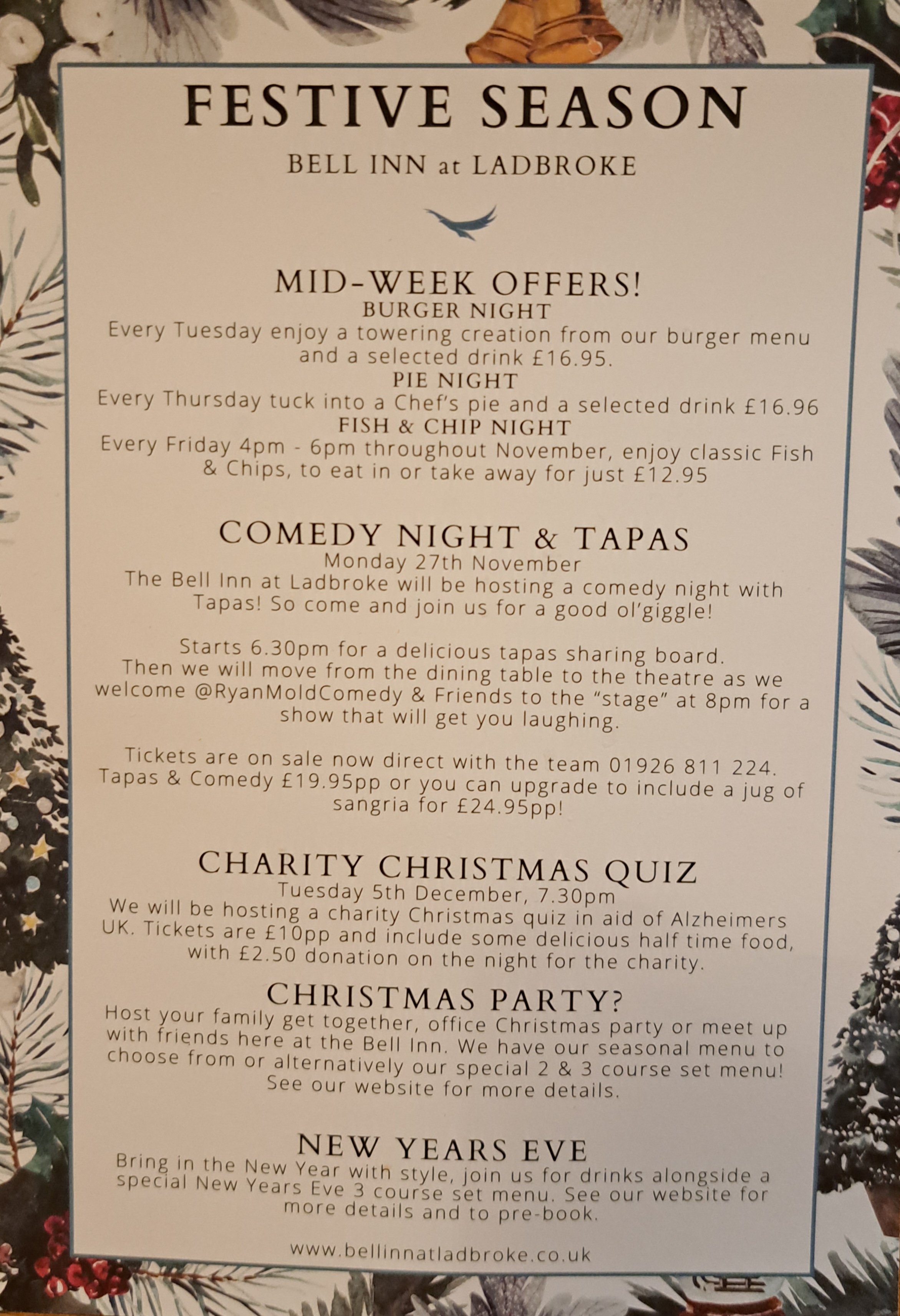 Charity Christmas Quiz: Tuesday 5th December – 7.30pm: We will be hosting a charity Christmas quiz in aid of Alzheimers UK. Tickets are Ā£10pp and include some delicious half time food, with Ā£2.50 donation on the night for the charity.