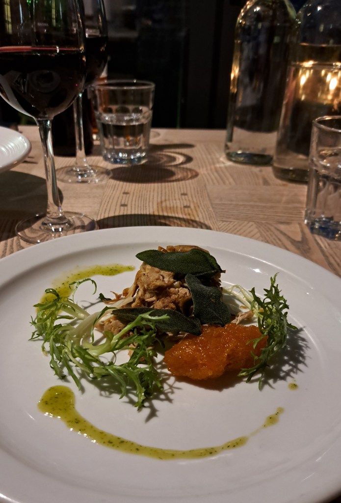 - Slow Cooked Duck Ballotine, Apricot Jam, Crispy Sage & Micro Leaves