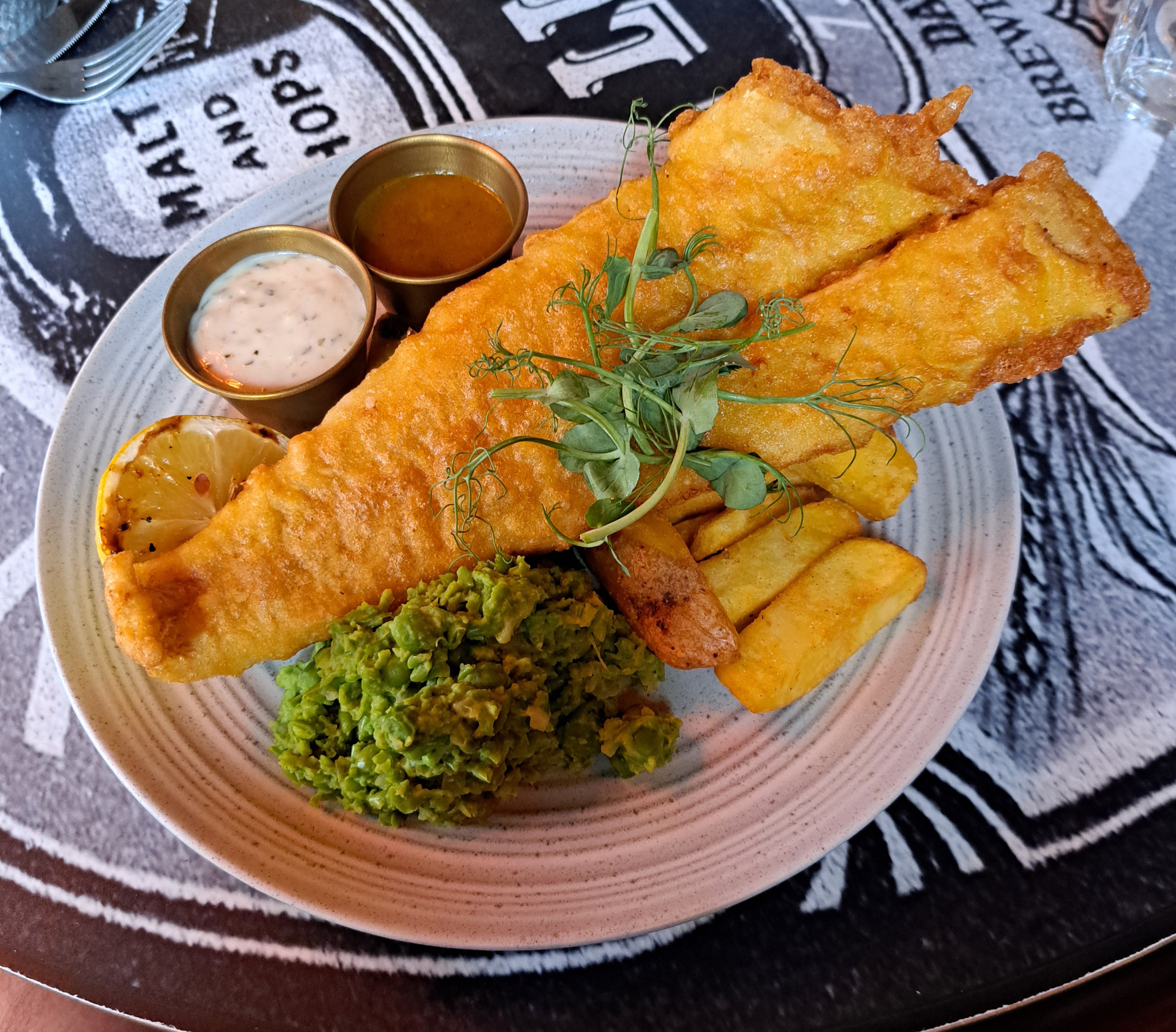 The Coach House has always focussed on home-cooked food using quality, locally-sourced ingredients. Many of the menu choices are paired with a beer suggestion which I think is an excellent idea. It was a Friday on the day of my visit, so I opted for the Davenports Beer Battered Fish & Chips. Hand battered in our own award-winning Davenports lager. Too often when eating out I find the batter is too thick and I end up leaving it at the side of the plate. This batter was very light & crispy, a perfect battering for the fish. My fish was delicious, served with homestyle chips, cooked with the skins still on, lots of mushy peas, a charred lemon, small bowl of tartare sauce and very light curry sauce for dipping the chips! Just perfect. I paired my meal with a Davenports Mild 3.5%. A wonderful, traditional Mild draught beer. It had a smooth, dark complexion with fruity aromas which gave way to a full-flavoured taste & a noticeable sweetness.