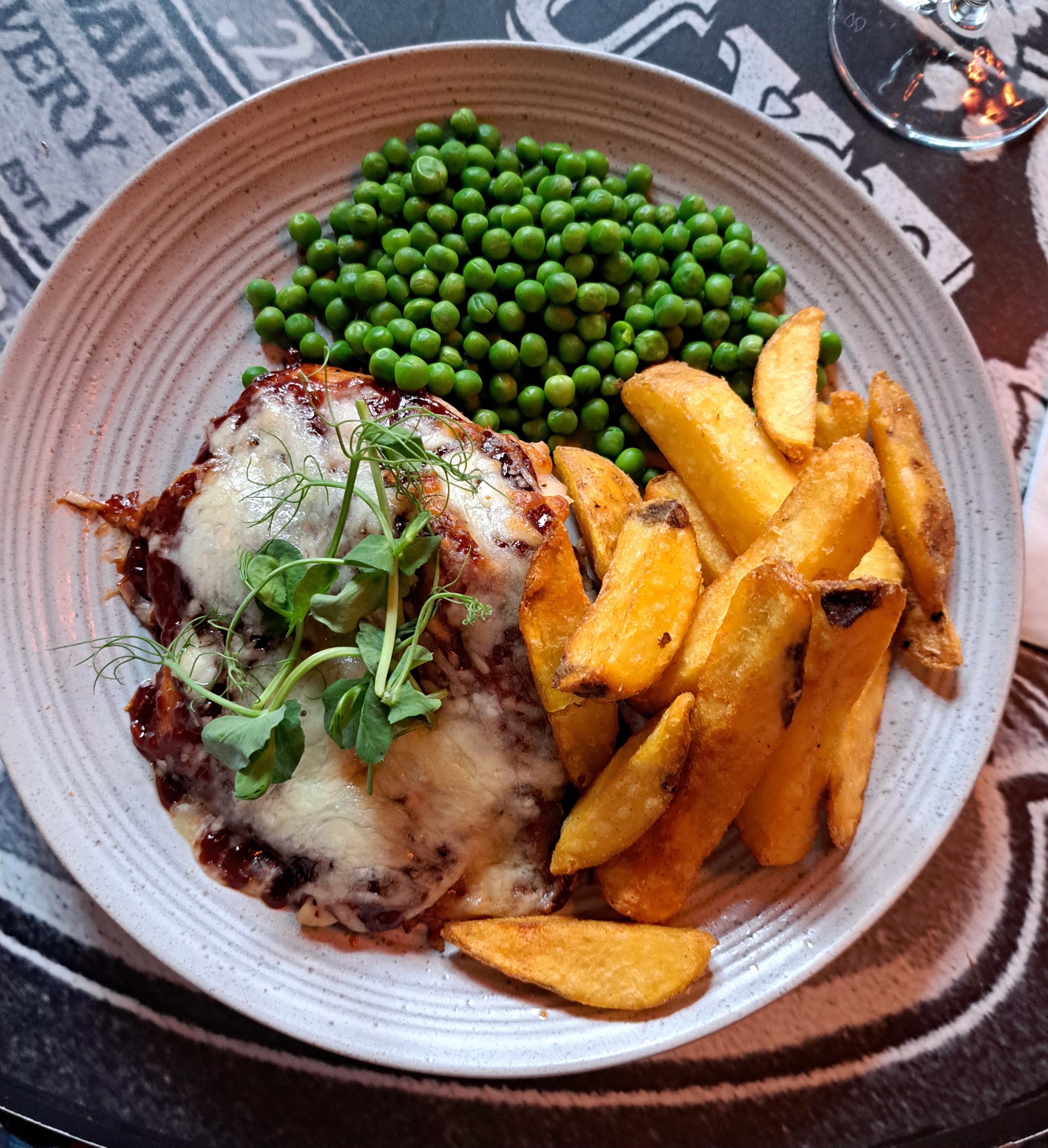My wife chose the Hunters Chicken. Plenty of small pieces of grilled chicken breast topped with candied bacon, melted cheese and smothered in our sweet BBQ Bourbon glaze. Again, served with the homestyle chips. My thought that there was too much of the sweet BBQ Bourbon glaze but admitted that was a personal taste. She would have preferred the glaze in a pot at the side so that she could have put on to the chicken as much glaze as she wanted!