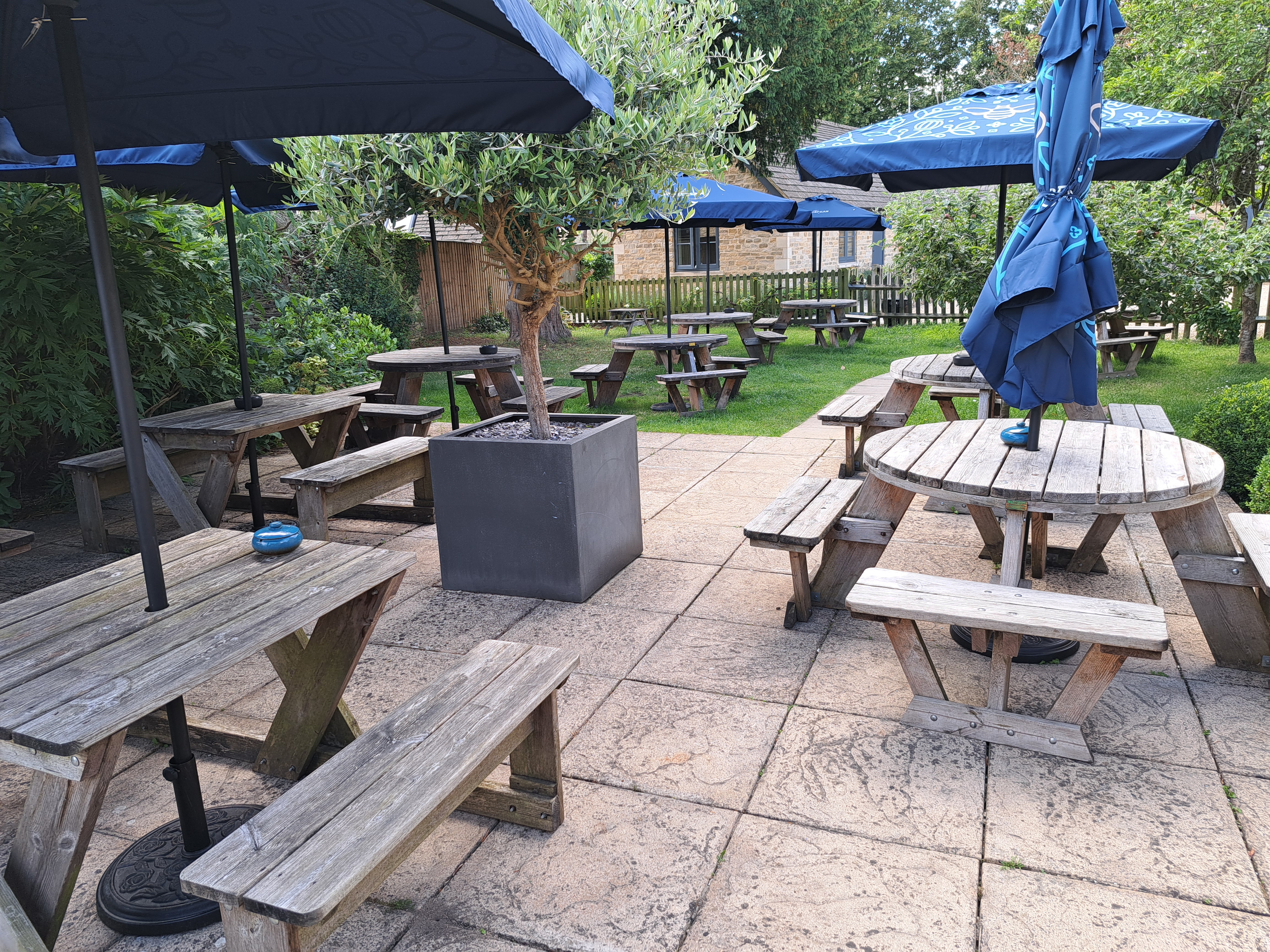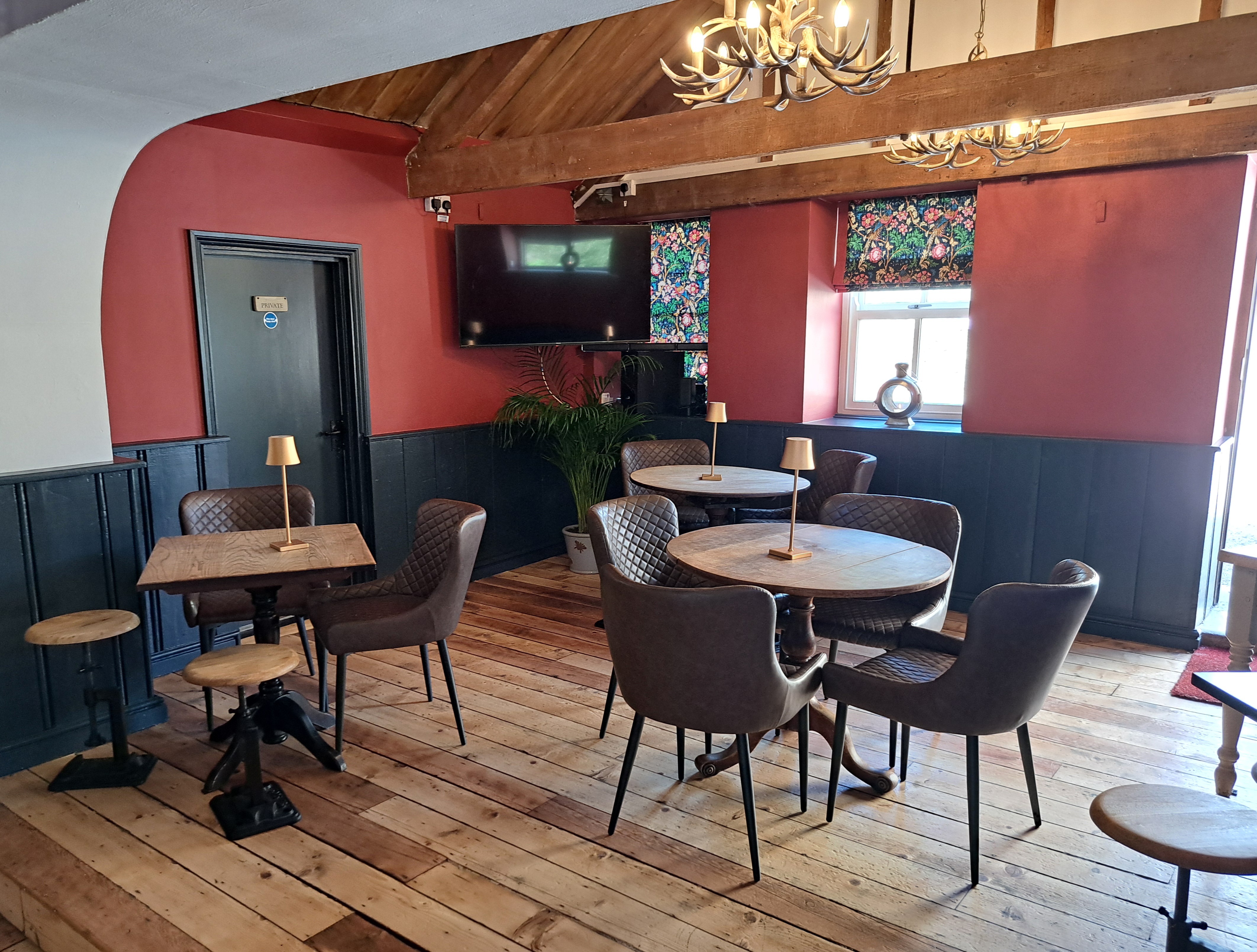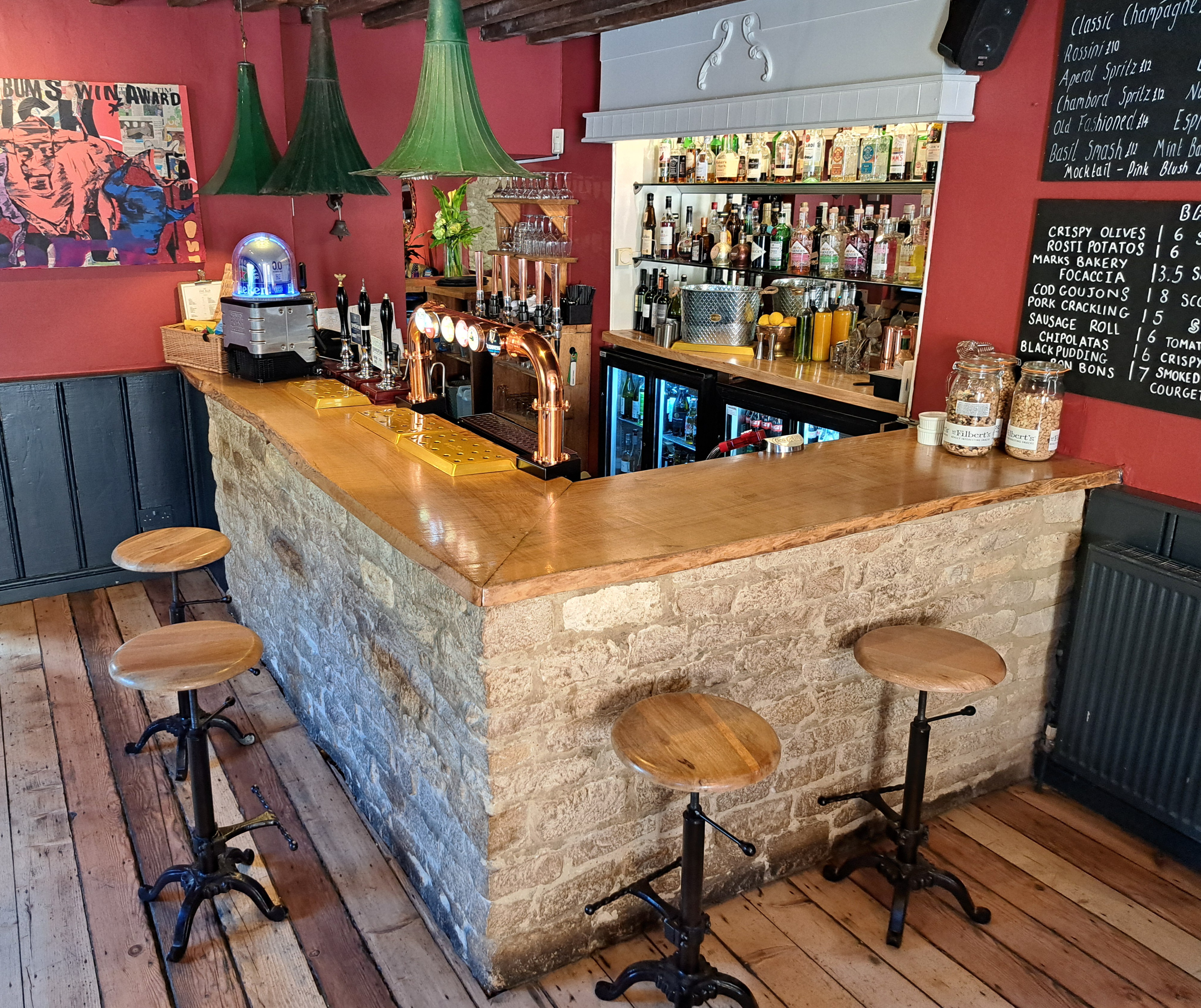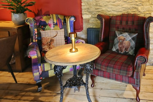 The pubs charm & character is enhanced throughout with several restored & original features such as the rendered Cotswold stone walls, flagstone or oak floors, inglenook fireplace, exposed oak beams and Georgian sash windows, which complement the Cotswolds chic décor to create cosy, welcoming and stylish interiors. Original works of contemporary art decorate walls alongside some quirkier touches such as antique gramophone speakers upcycled as pendant lights in the main bar, alongside antique kilims, Ikat cushions, linen curtains and Roman blinds.