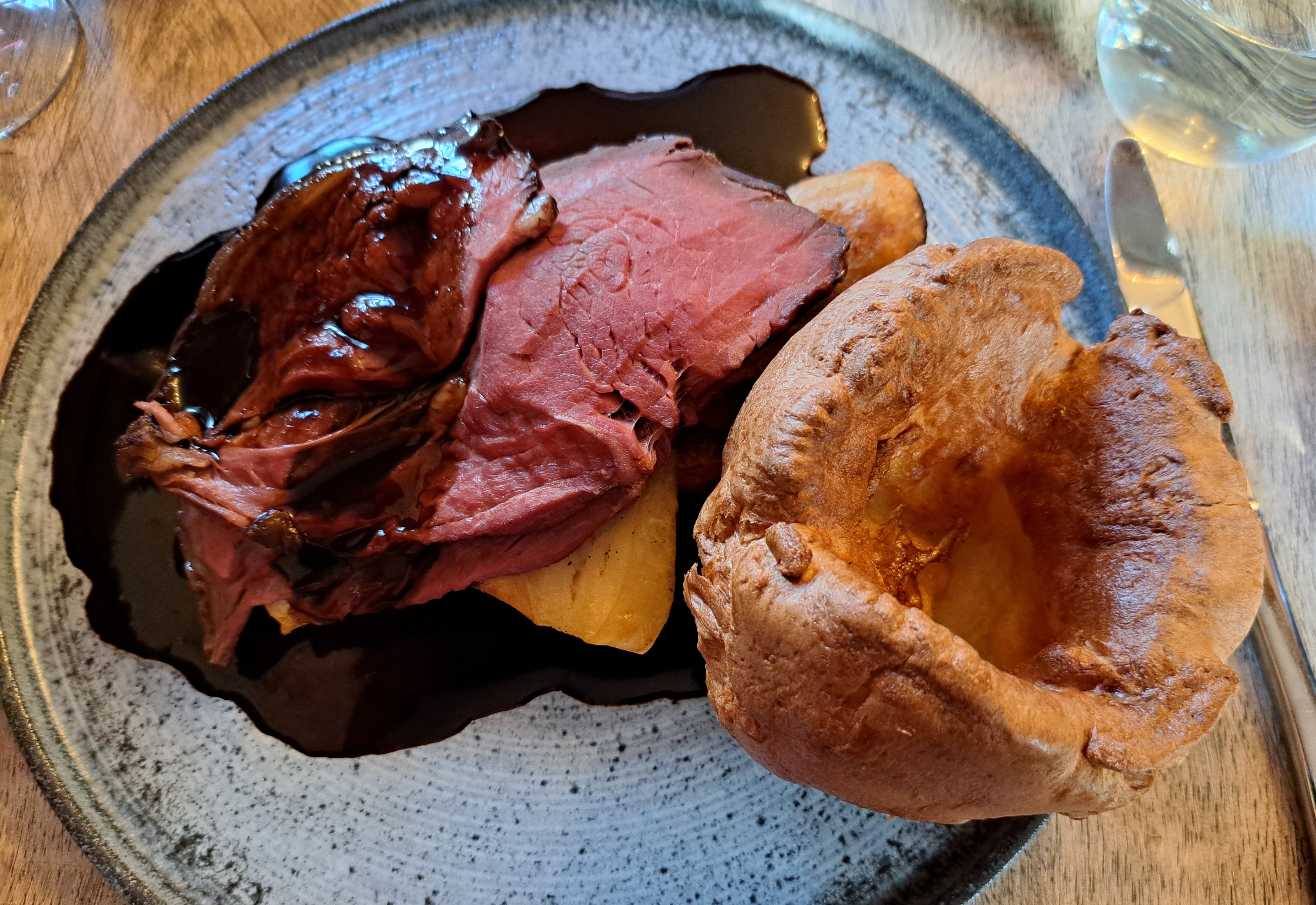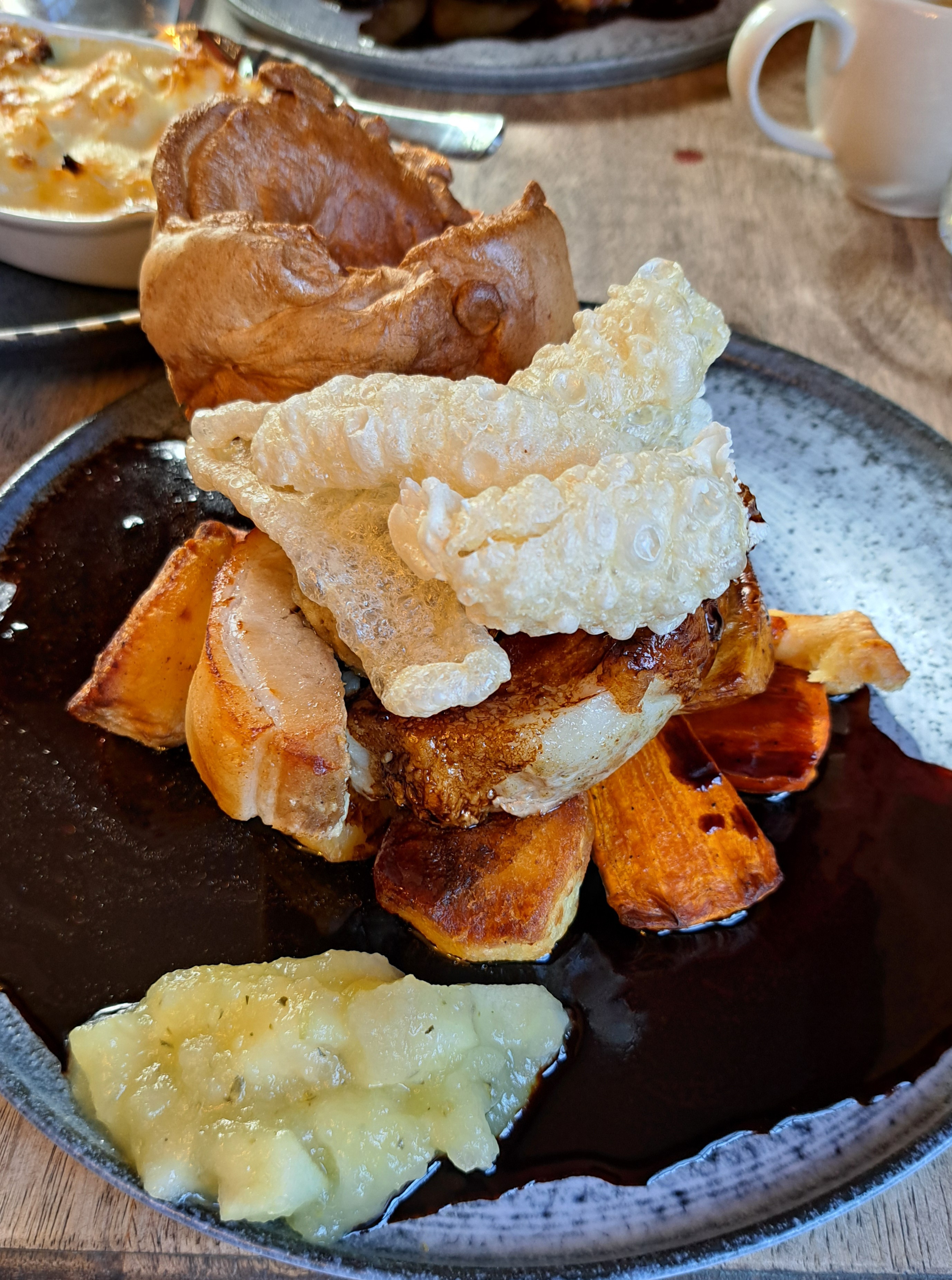We were presented with a mountain of food! We really couldn’t finish off the yorkies! The rich gravy sauce was simply wonderful, we were even given an extra boat of sauce, which we hadn’t asked for, but appreciated. The roast vegetables, cauliflower cheese, broccoli & diced cabbage was a real delight. They added to the dishes. Table service was excellent, a quick shout out to Cecelia, who was fantastic. She took the time to find out about us, offering stories about the village & local area and simply making my wife & I feel very welcome. The roasted pineapple was a pleasant surprise! Served with a small ball of mango sorbet & grated coconut, it was a very special dish, which I shall definitely try again, if I come across it on a dessert menu.