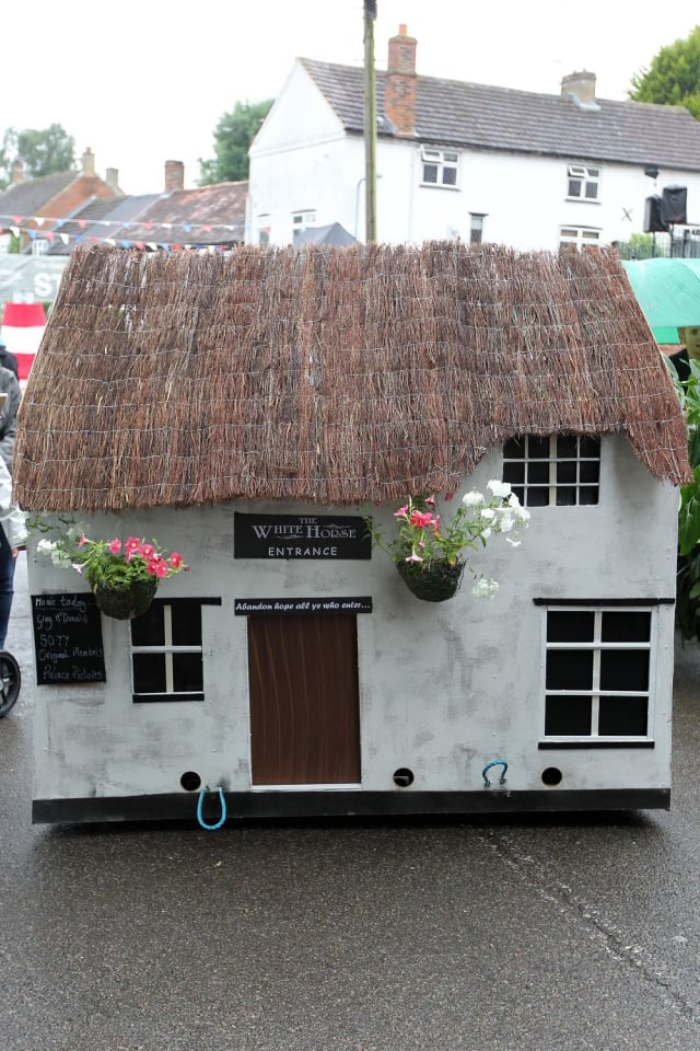 My favourite was, `The White Horse – The Grand Tour` in 2017, which was a replica of the village pub, complete with thatched roof, punters at the bar with beers; a blow-up landlady, hanging baskets and toy dogs. Genius! Other creative carts included HMS Tempest, a submarine, Wookie-Leaks & even an X-Fighter from Star Wars. This year some of the most creative carts were the Combine Harvester, the GoCa -Cola can, Reliant Robin & Orca Rides Again, not forgetting the DeLorean time machine in homage to Back to the Future.