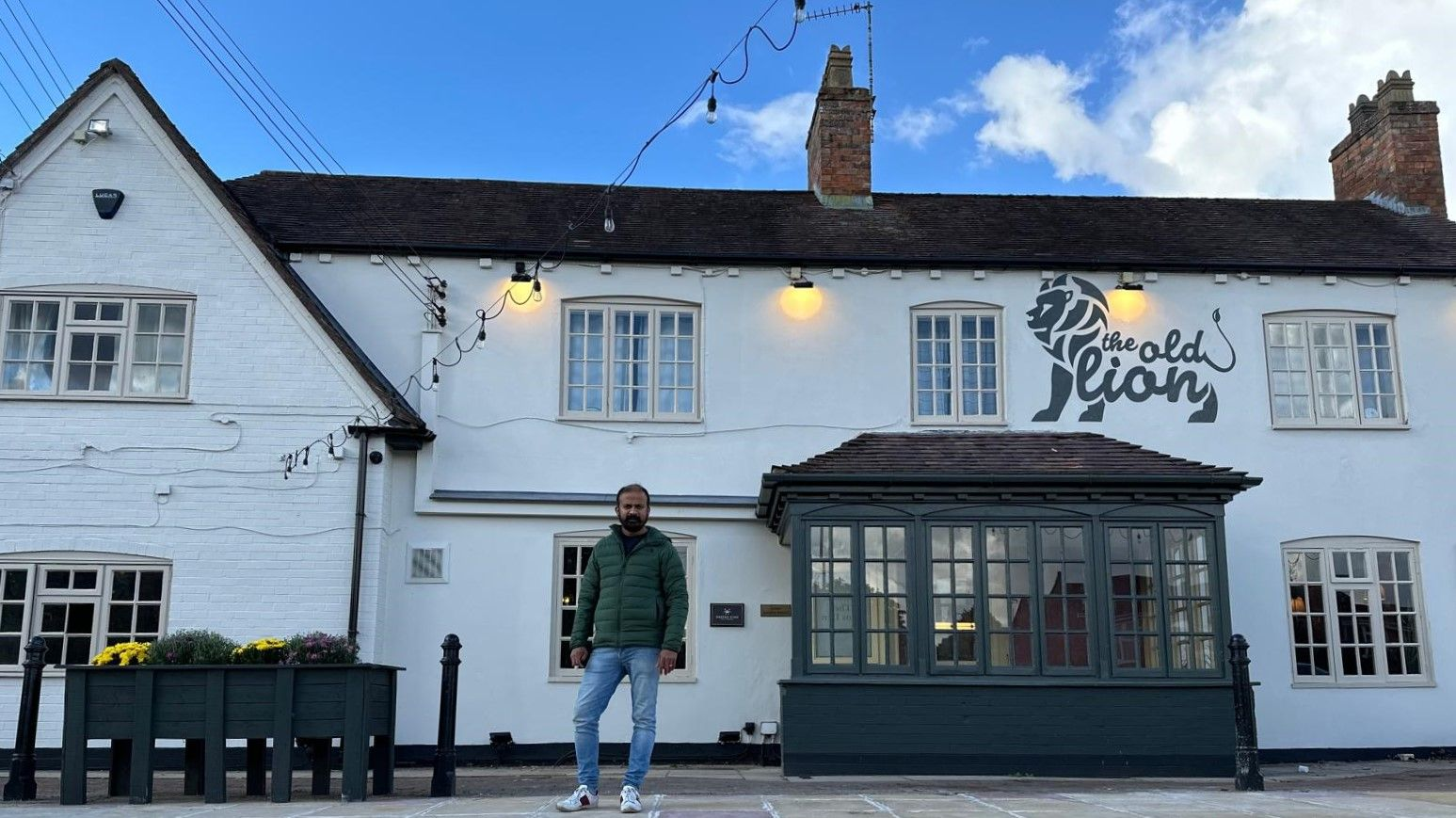 Harishankar outside The Old Lion at Harborough Magna with its fresh exterior and new logo