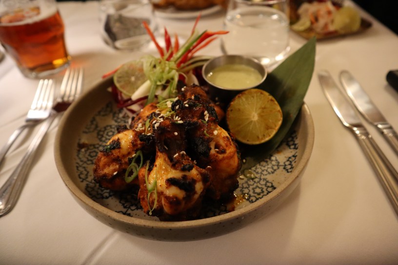 Delicious starters on The Old Lion’s menu included tempura soft shell crab served with telicherry pepper, saunf slaw and plum chutney, curry mile naga wings served with Asian slaw, charred lime and a basil and mint chutney and Welsh lamb seekh kebab served with crispy corn and a fig and tomato chutney. My wife and I opted for the shell crab and naga wings. The wings were wonderfully hot with a mixed slaw which complimented them perfectly. A mix of cabbage, fennel swirls, beetroot, spring onion & a little chilli were very satisfying on the palate & the mint chutney refreshing! The tempura crab was of course deep fried, crispy on the outside and tasty on the inside. There was quite a lot of crab too, which was very pleasing!