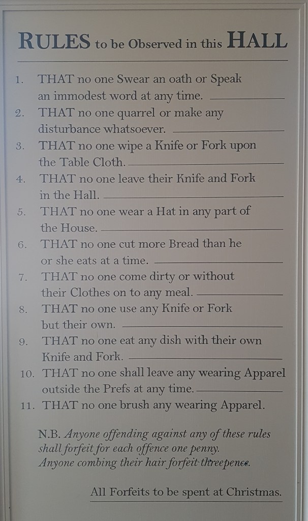 I started my self-guided tour in the dining room laid out with a sumptuous meal. Video display screens in many of the rooms provided text & oral commentary of the features to be seen in the room and further information about Jane Austen’s associations with the house. Strategically placed teasels warned visitors not to sit on any of the chairs in the rooms. In the parlour I noticed a reference on a painting to the `Dicky Dongle Dance` but could find no other information about this dance on the internet!