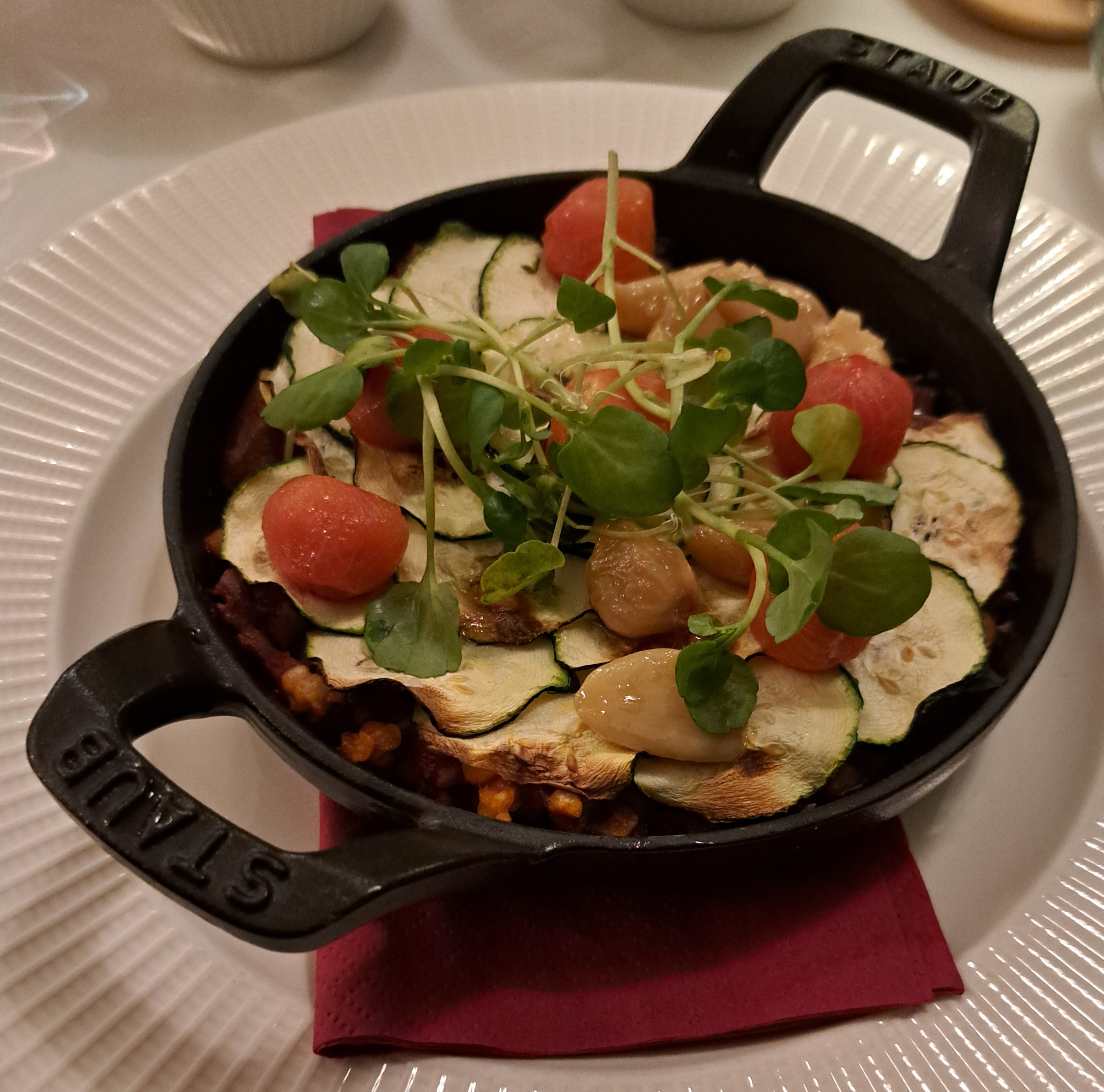 - Fregola semolina pasta with aubergine, courgette & confit garlic ratatouille served on a French Staub cast iron cookware bowl.