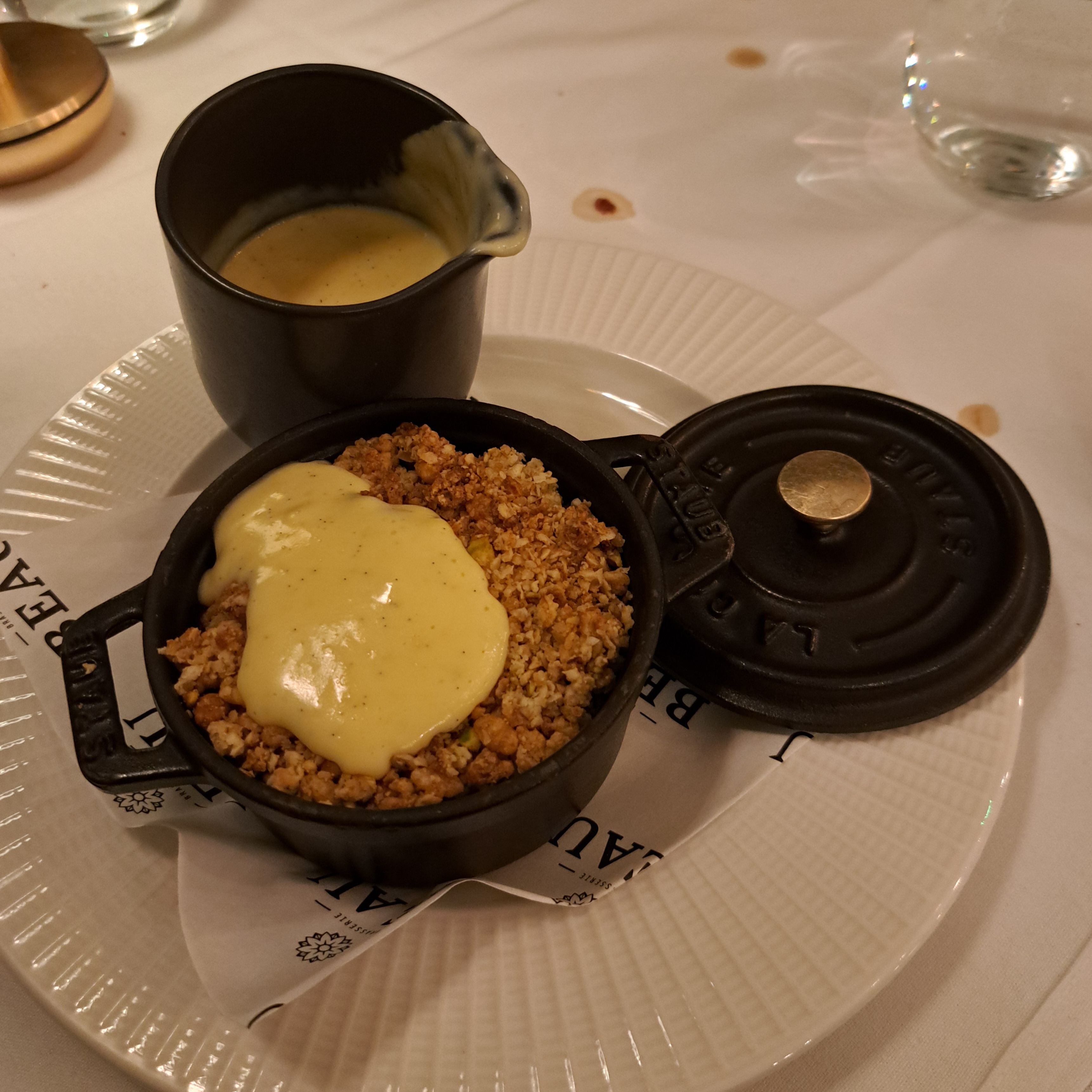- Apple & Blackberry Oat Crumble served in French Staub cast iron cookware which included a jug of hot creme anglaise (custard).