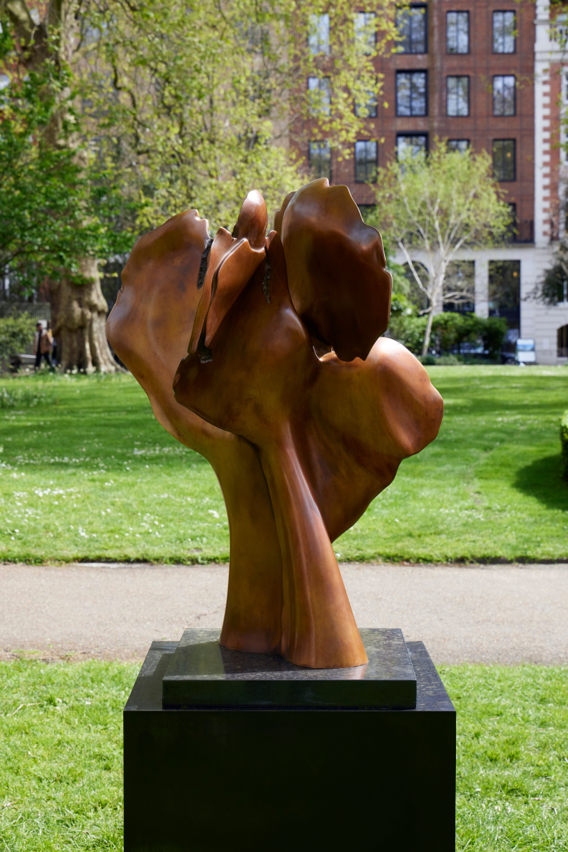 In the gardens – Tree of Life: Encounter (2018) depicts a plant-like structure, where three strands are joined together at the base but separate and flower in an upwards movement. Originally commissioned by the Woolf Institute with the notion of uniting religions together in peace, the flowering represents hope that is breaching dissonance and chaos. Volare (2015) and Flight (2009) both depict movement with a merging of the physical and spiritual. The essence of the human form is depicted in an aspirational reach upwards, towards the sky and a higher realm of being.