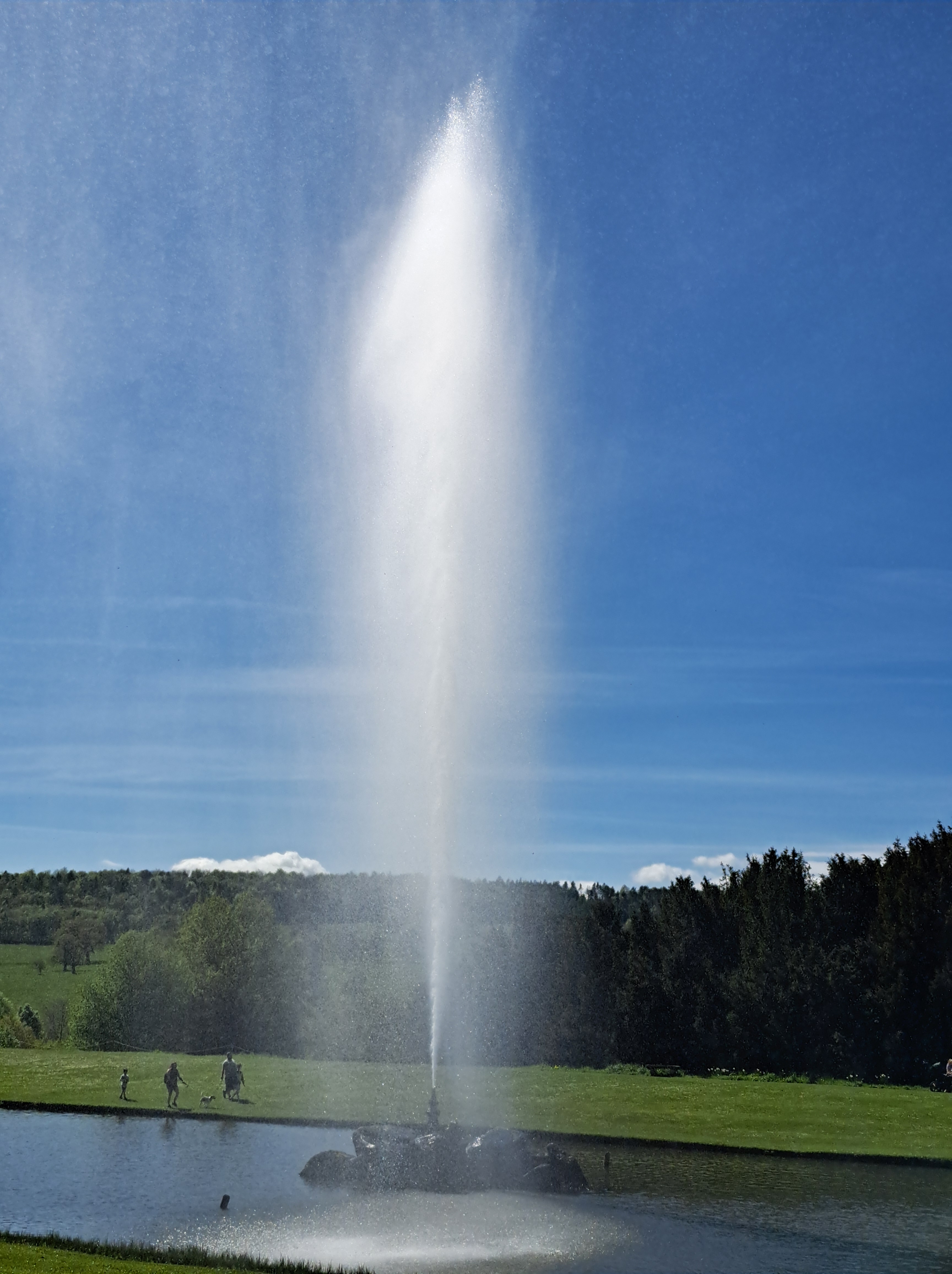 The Emperor Fountain was constructed in 1844, and is at the north end of the Canal Pond, which was dug in 1703. The water jet is on record as reaching a height of 296 feet (90 m). It is always an impressive sight and a huge draw for the visiting children, who stand close to the pool, waiting for the wind to carry the spray all over them! Today, was no different!
