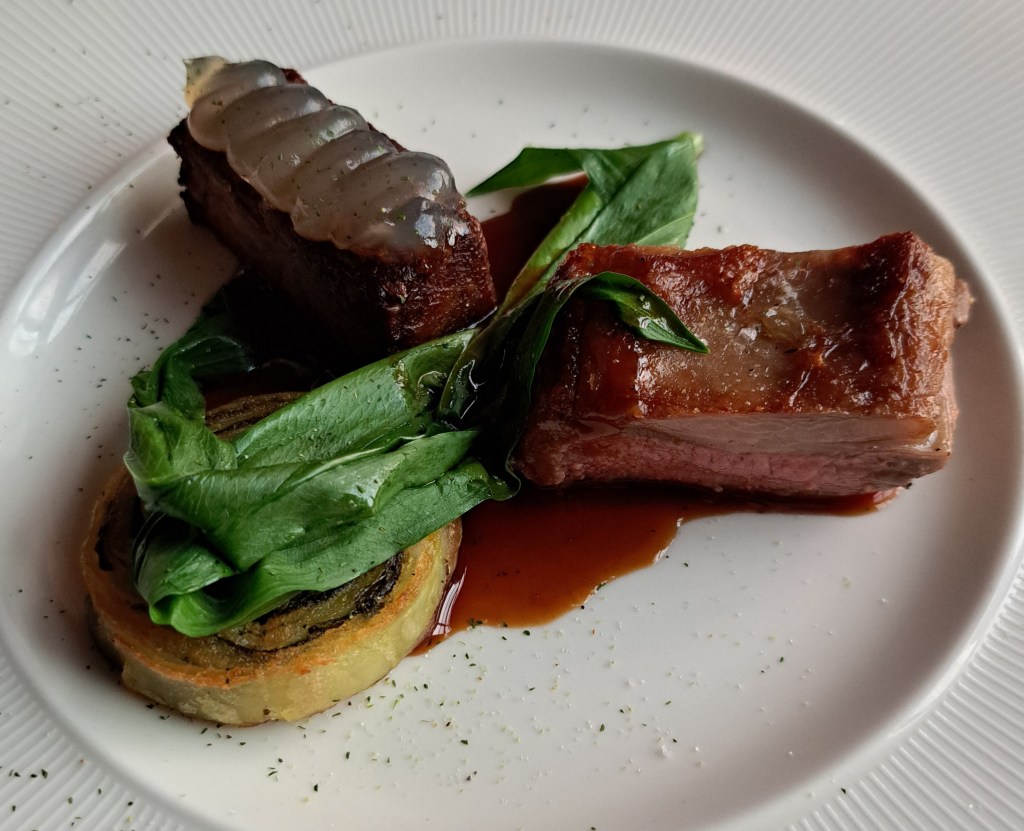 Chatsworth Hogget, Shoulder & Loin with Wild Garlic, Nori & a potato swirl. A Hogget is a juvenile sheep, not a pig or Hog! It is a young ewe or tup between 11 to 24 months old. The slow growing ethically raised Chatsworth hill sheep, live a good life, taking longer to fatten, producing a meat which has a richer, stronger taste and is much more flavoursome, than the young lamb or older mutton. I particularly liked the shoulder, which had been cooked slowly with Nori, an edible seaweed, much used in Japanese cookery. Alongside the mint jelly & wild garlic, it added a strong & distinctive edge, to what was an exceptional dish full of flavour & texture with a slight sweetness. The Dish of the evening for me!