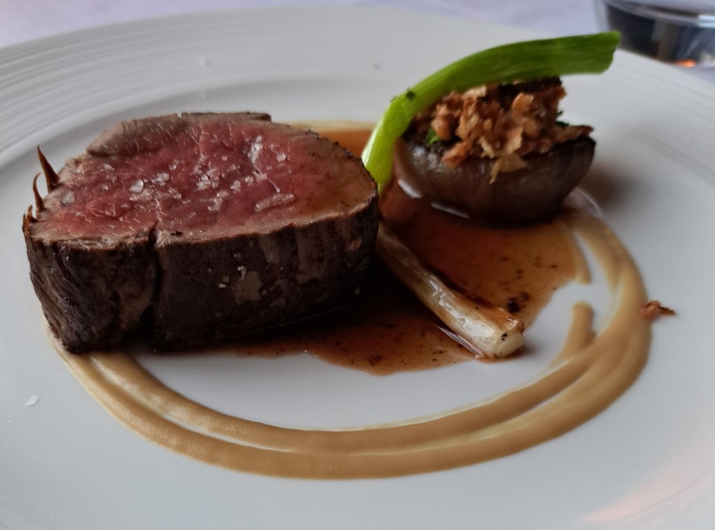 Chatsworth Beef Fillet, Vanilla & Peppercorn Sauce, Roscoff Brittany Onions & Spring Onion. The Chatsworth cattle have free range across the estate foraging on berries, crops & fresh grass, which has produced a tender, succulent grass-fed fillet steak. A perfectly cooked beef fillet, full of flavour. Deliciously tender Chatsworth Farm beef fillet. Simply wonderful!