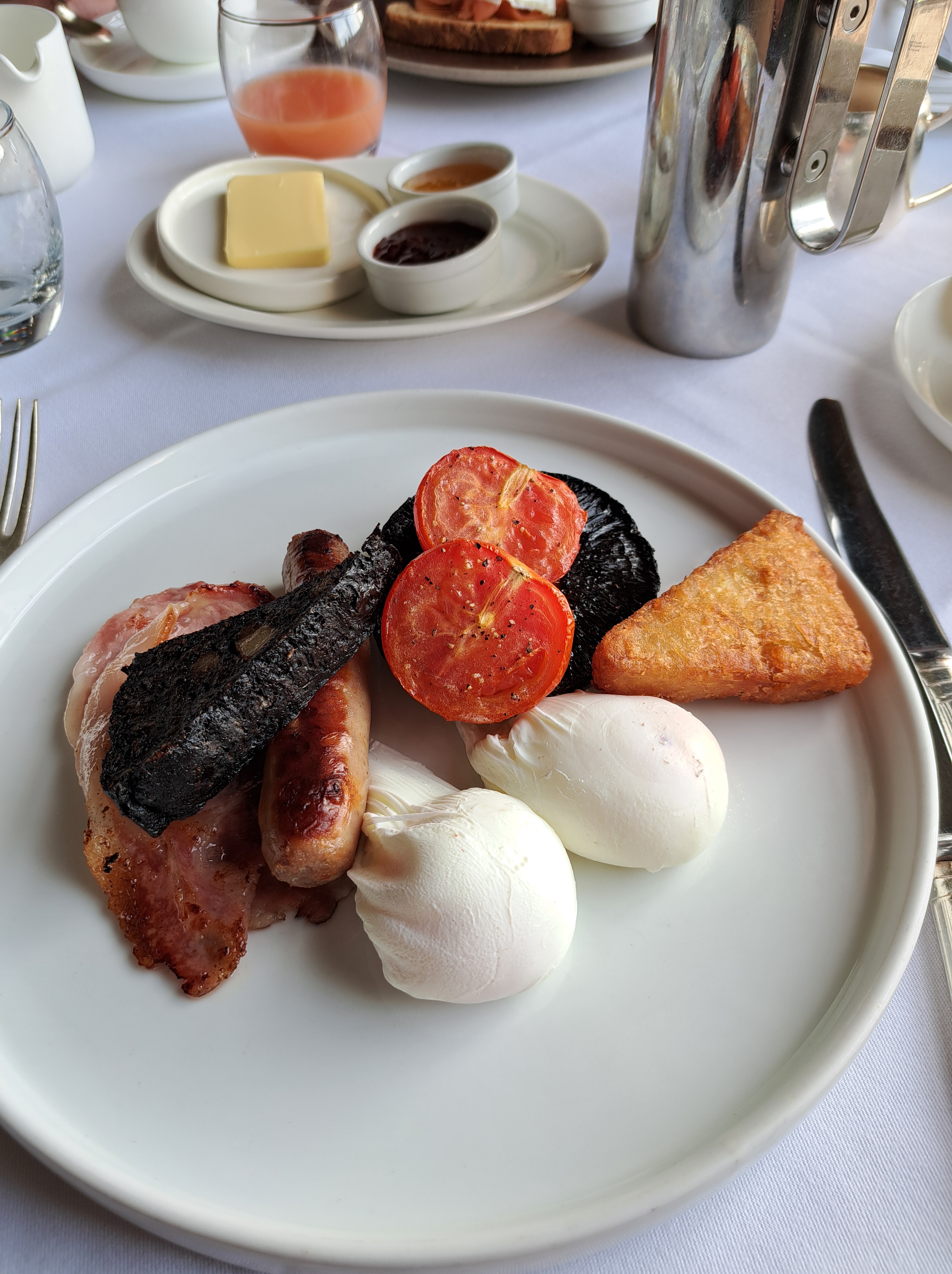 Breakfast did not disappoint either. It was well worth getting up for! A light breakfast selection was available alongside the more conventional Cavendish Breakfast selection, which included my choice, The Cavendish Breakfast, with smoked bacon, sausage grilled tomato, mushroom, black pudding, hash brown, poached eggs & plenty of toast. My wife chose Eggs Royale, Smoked salmon on an English Muffin, with poached eggs & a small bowl of hollandaise at the side (as requested) For the celebratory visitors, the Champagne Breakfast with a glass of Laurent Perrier Brut/Rose or Cavendish Bucks Fizz, was also on offer.