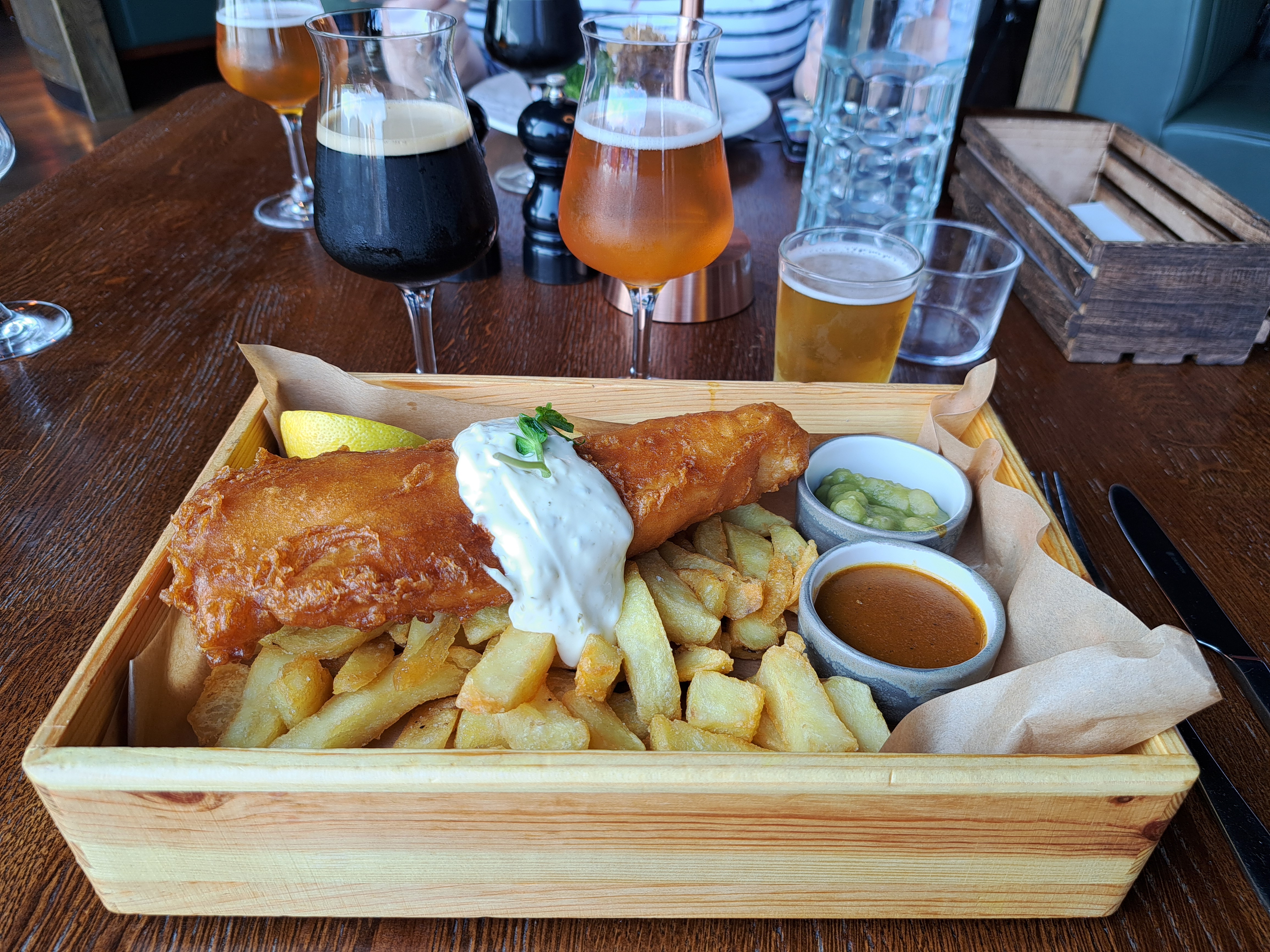 The Drunken Sailor: Crispy Beer Battered Hake, served with Chunky Chips, Curry Sauce, Mushy Peas, Tartar Sauce and a Taster Glass of Killarney