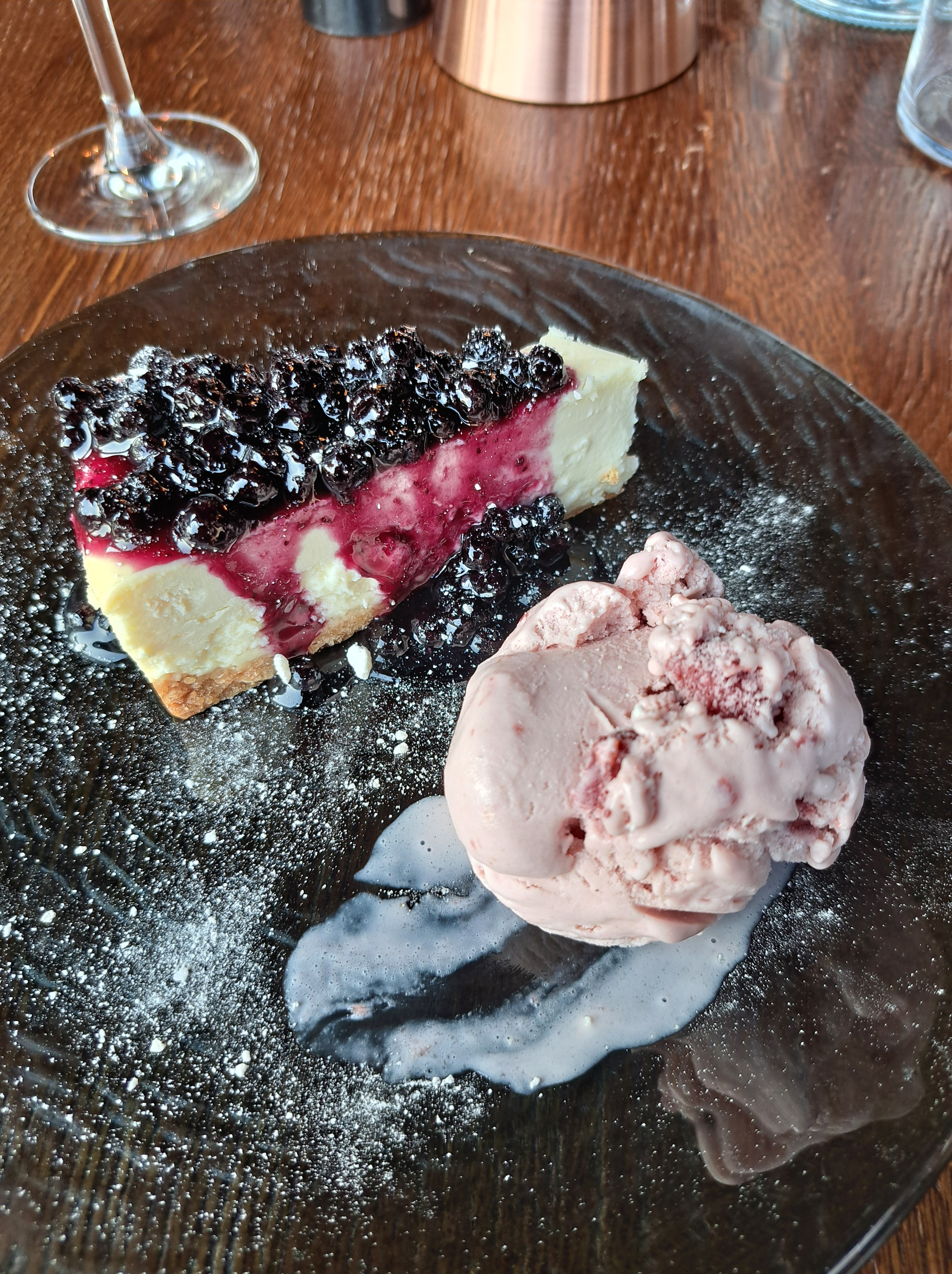 Desserts: Blueberry & Killarney Gin Baked Cheesecake with Raspberry Sorbet & a Chocolate Fudge Brownie & Cream filled Profiterole with Dark Chocolate sauce.