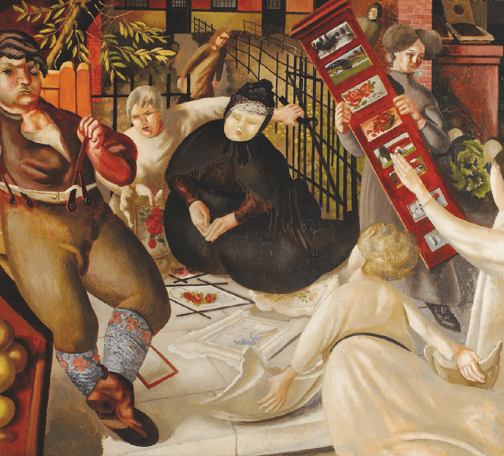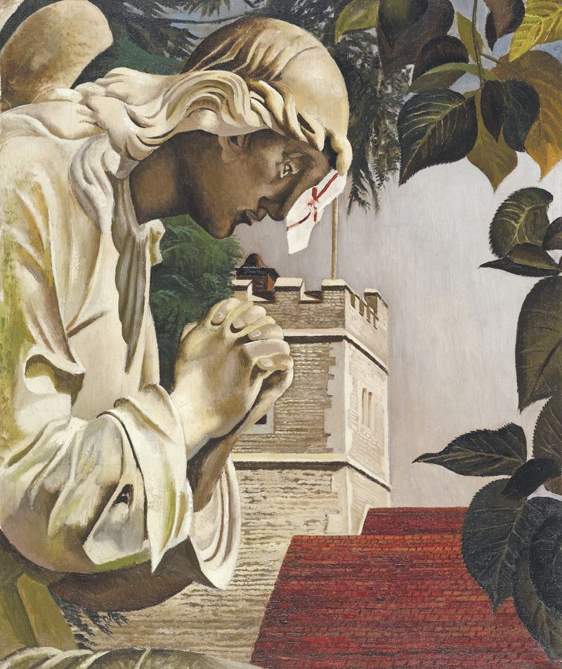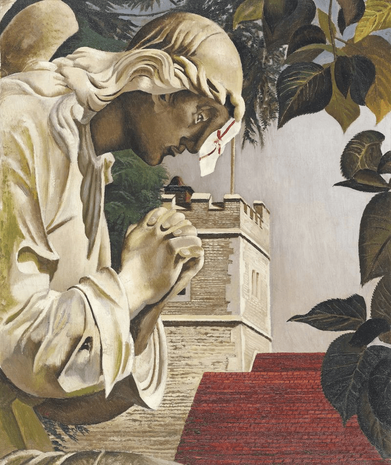 Sarah Tubb and the Heavenly Visitors (1933) is an example of how familiar places and spaces could become scenes of the divine. The painting relates to a story told to Spencer by his father, in which Old ‘Granny’ Tubb was so startled by the appearance of Halley’s Comet that she fell to her knees in Cookham High Street and began to pray. Perhaps as a visual call for the viewer to open their own eyes to the hidden spiritual world all around us, Spencer shows the elderly woman comforted by angels or ‘heavenly visitors’.