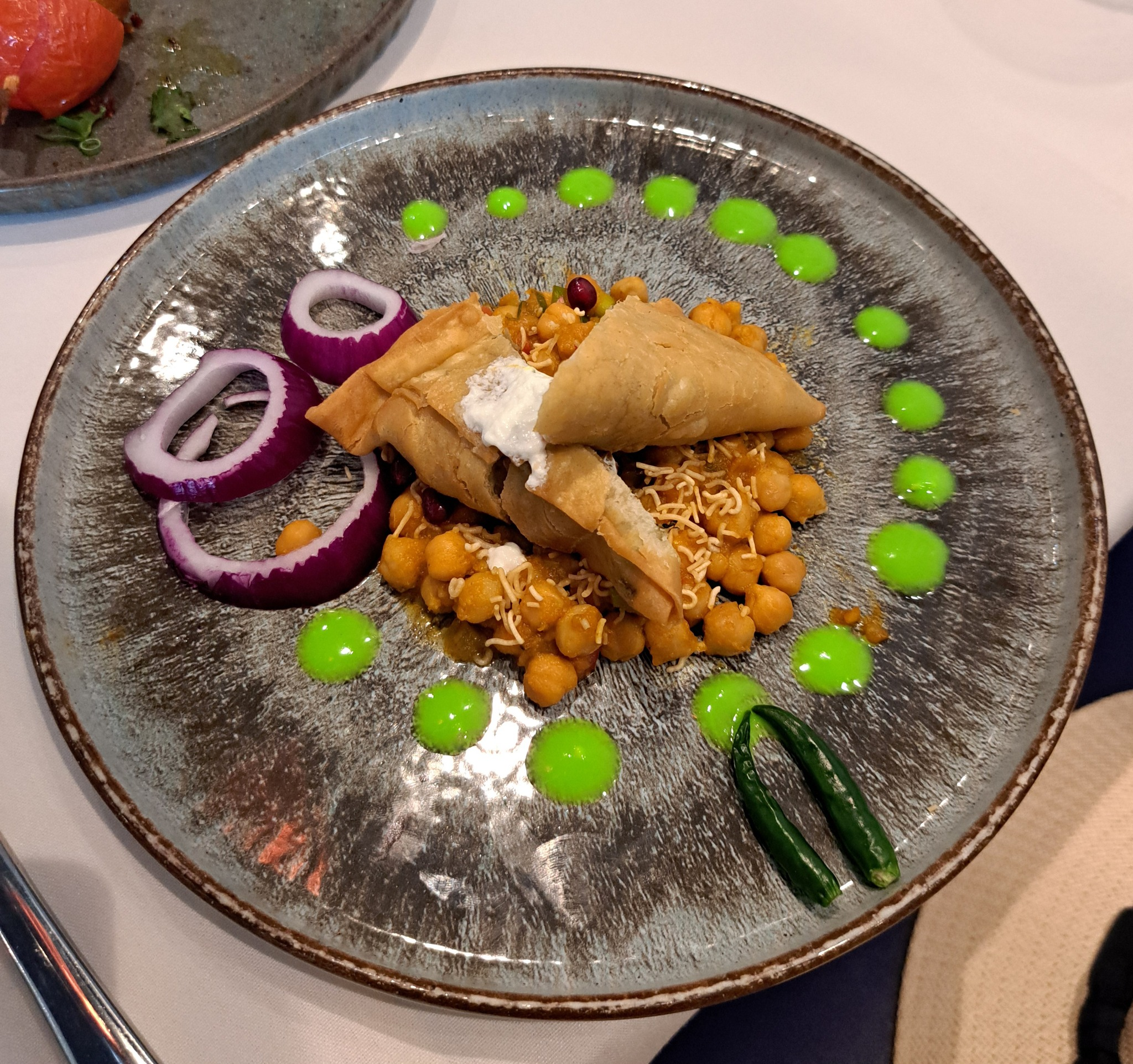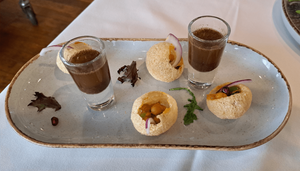Pani Puri or Golgappa. Small crispy hollow, fried wheat shells, bowls or cups, filled with spiced mashed potato, chickpeas, red onions, pomegranate and sev, which are small pieces of crunchy noodles, made from chickpea flour paste, then served with a shot of Tamarind pouring sauce. It was a fine way to start the meal, by pouring the tamarind sauce into the small hollow shell, containing the small pieces of vegetables. I even managed to eat it, without pouring it down my front!