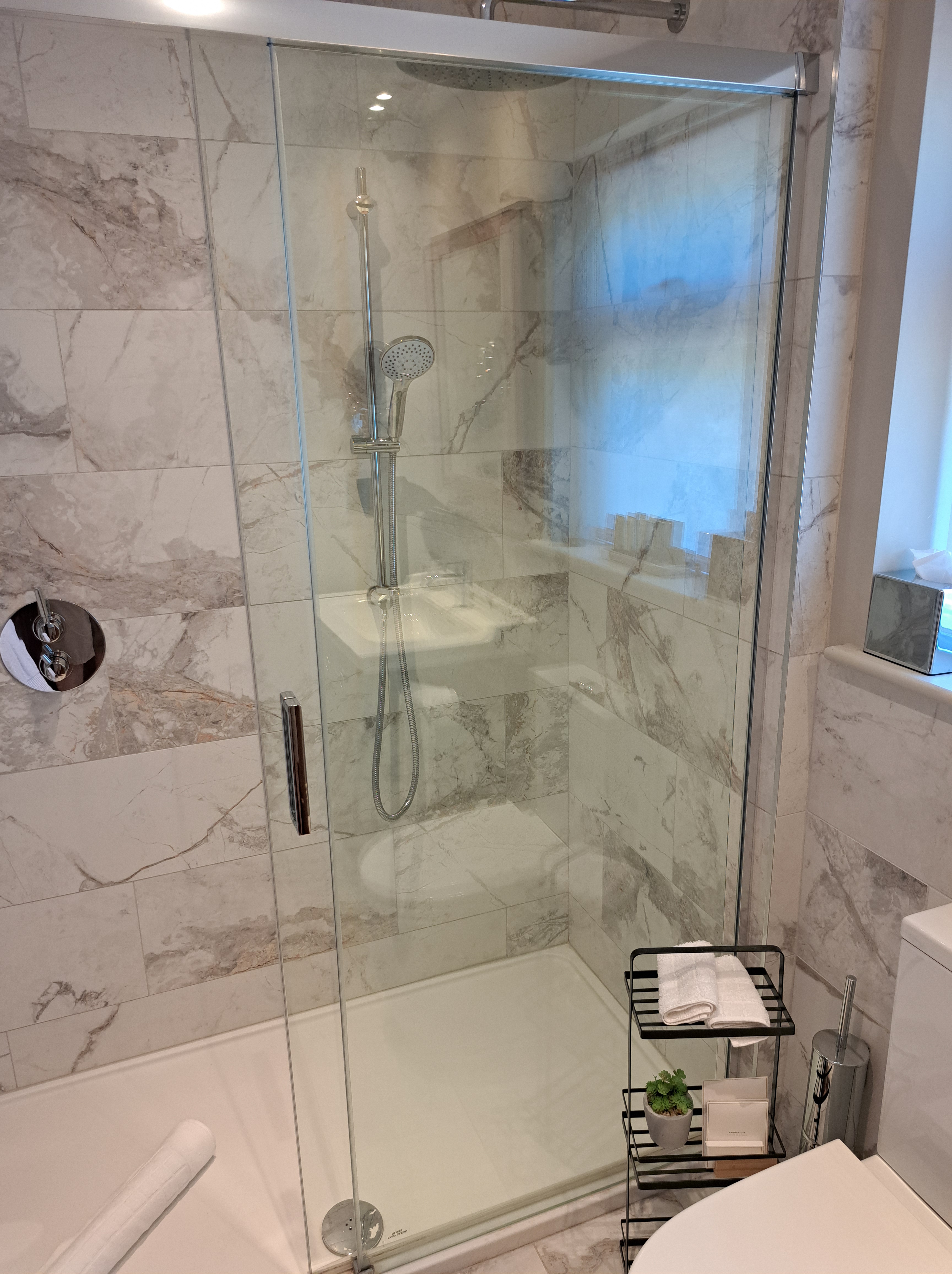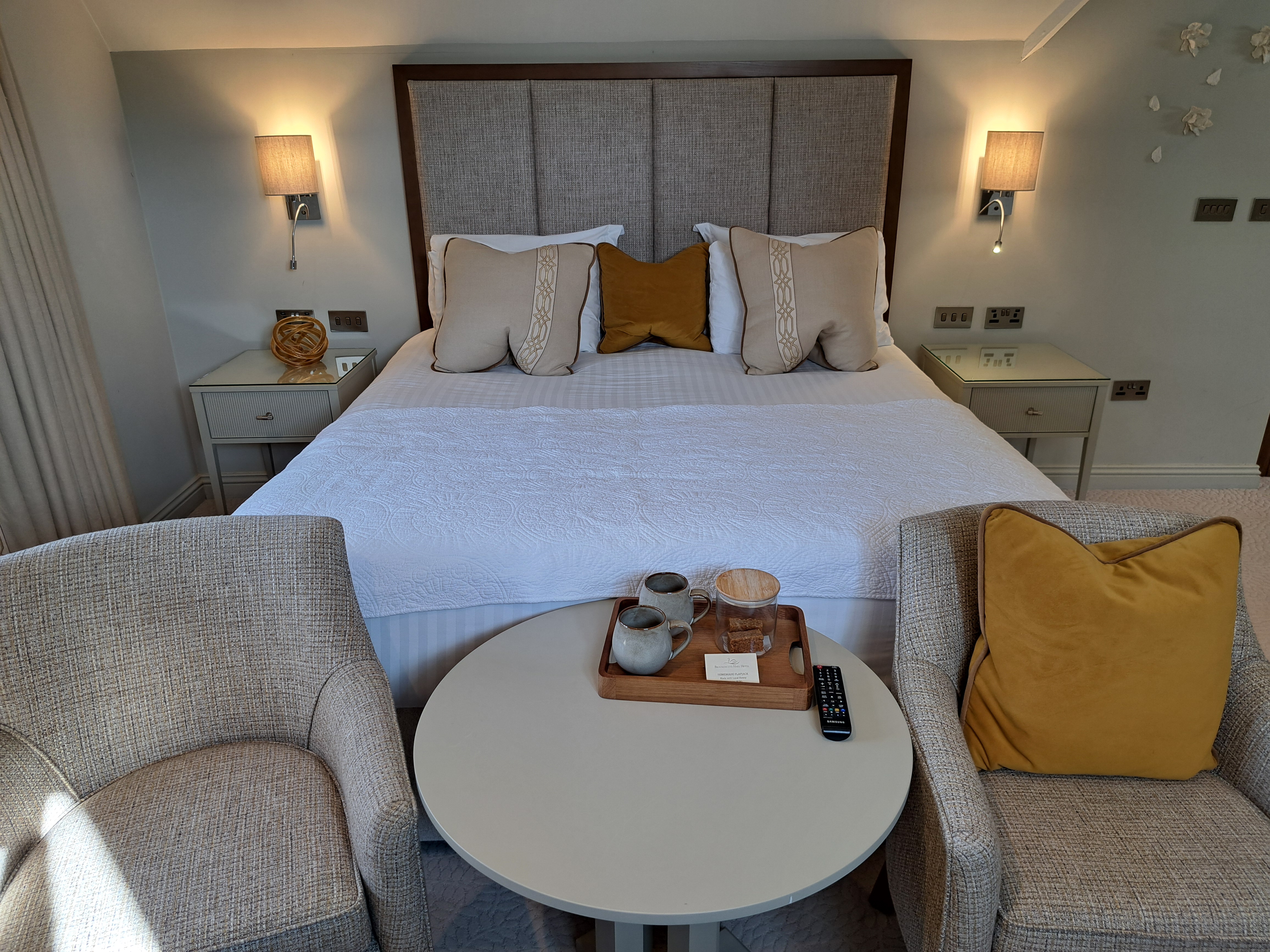 Our spacious feature bedroom was very peaceful and comfortable room with a king sized bed, two armchairs with a table and dressing table with a chair. The décor was tasteful, traditional and beautifully appointed. The room included a wide range of tea sachets and an Espresso coffee making machine, a Hairdryer, Flat screen Freeview Television, a Safe and most impressive of all, a large state of the art Ensuite bathroom with shower, bath robes, large fluffy towels and Luxury toiletries.