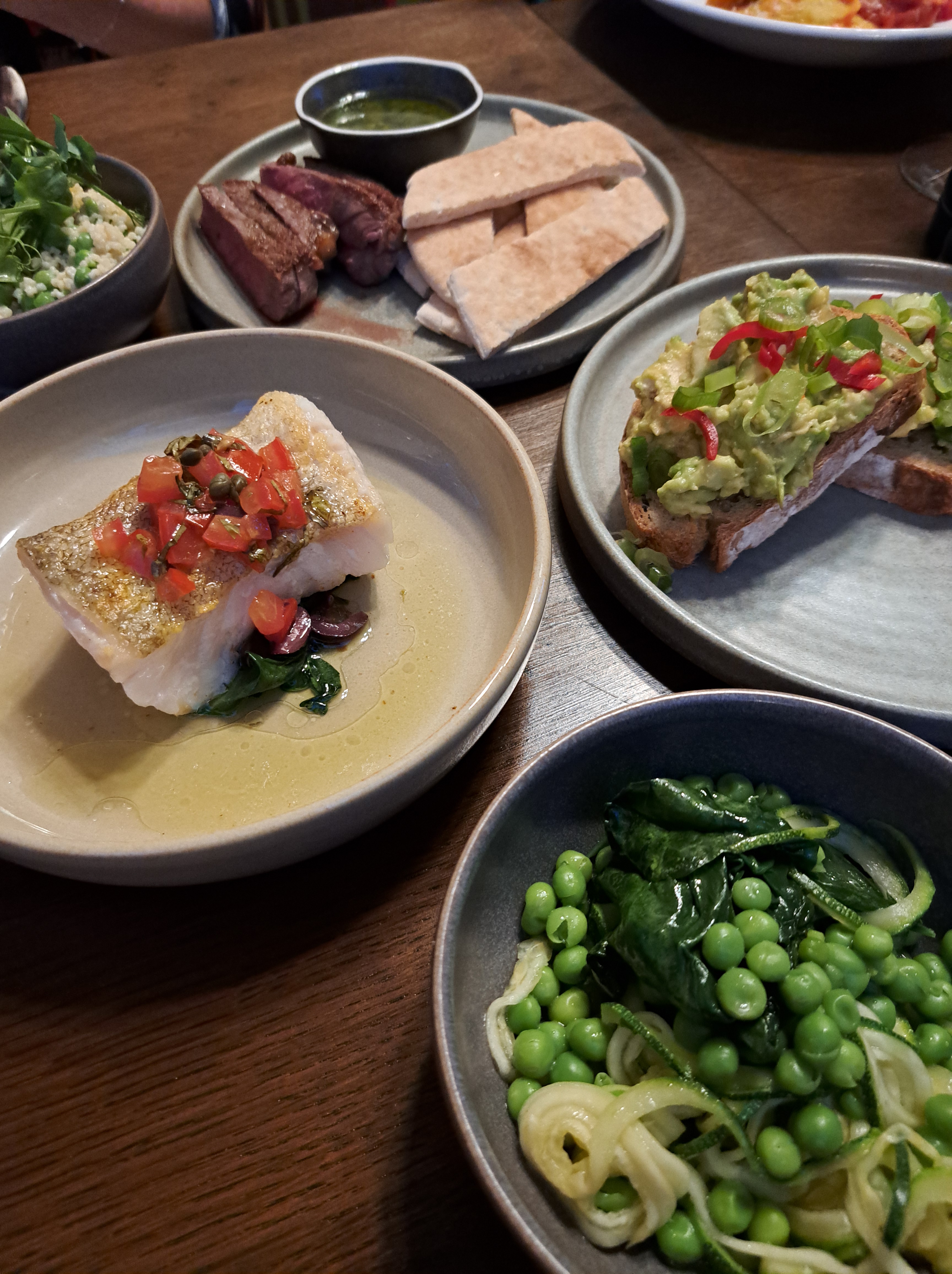 1. Pea, Cous-Cous & Smoked Yogurt. 2 Heritage Tomatoes, Red Onion & Balsamic. 3. Baby Leaf, Basil Pesto & Toasted Pinenuts. 4. Romaine Lettuce, Parmesan & Anchovy Mayo. 5. Market Fish – Cod, Spinach & Caper Sauce Vierge.6. Sourdough, Avocado & Chilli. 7. Beef Sirloin, Basil Pesto & Pitta Bread. 8. Spinach & Ricotta Ravioli, Arrabiata & Parmesan. 9. Sausage Casserole plus Sides of Triple Cooked Chips, Chive Butter New Potatoes & Seasonal Mixed Vegetables.