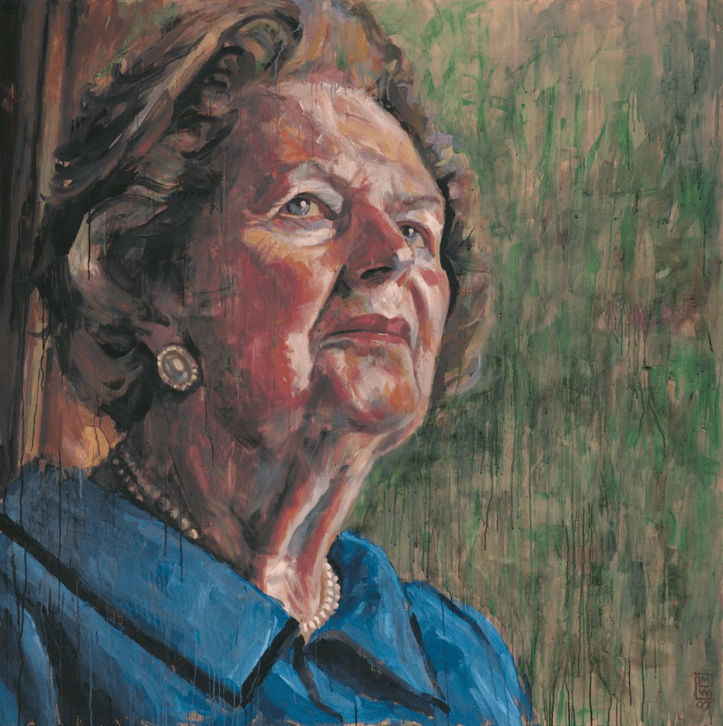 The exhibition features a monumental portrait of Mrs Thatcher, In Memoriam, alongside a series titled The Legacy Paintings, comprising of seven four-foot paintings which together explore her impact on UK politics and how she is regarded today, through Warholian repetition.