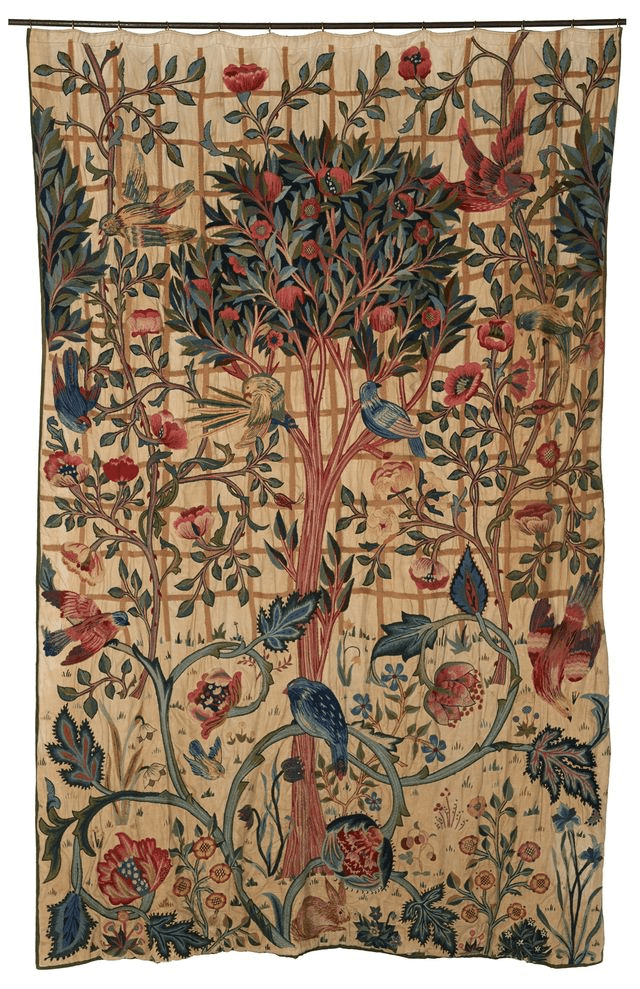 ‘Orchard’ bed curtain designed by May Morris for William Morris’s bed at Kelmscott Manor. Embroidered in wool thread on a wool ground, 1891-3 © Society of Antiquaries of London (Kelmscott Manor)