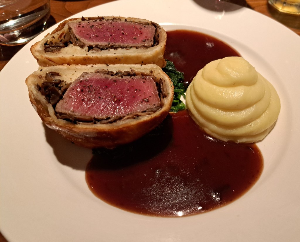 Gamekeeper`s Pie: Duck, Pheasant & Venison, Seasonal Greens and a side dish of Buttered Mash. A good quality filling with plenty of hot chunky pieces of tasty game meat, cooked in a very tasty rich sauce, topped with a potato layer. When I ordered the game pie, I was expecting it to be enclosed in pastry, with a pastry lid, not with potato mash, smoothed over the top. That is why I ordered potato mash, as a side dish. It in no way spoilt my enjoyment of the dish, which was excellent, but when is a pie, not a pie?According to the chairman of the British Pie Awards, a true pie has to have a filling completely enclosed in pastry, so a fish pie or cottage pie, don’t officially count as pies! I would certainly expect a game pie, to be enclosed by pastry. What do you think?